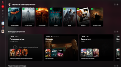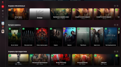 Главная — витрина контента с динамическими секциями: популярное, тренды, персональные подборки, трилогии, тематические блоки.