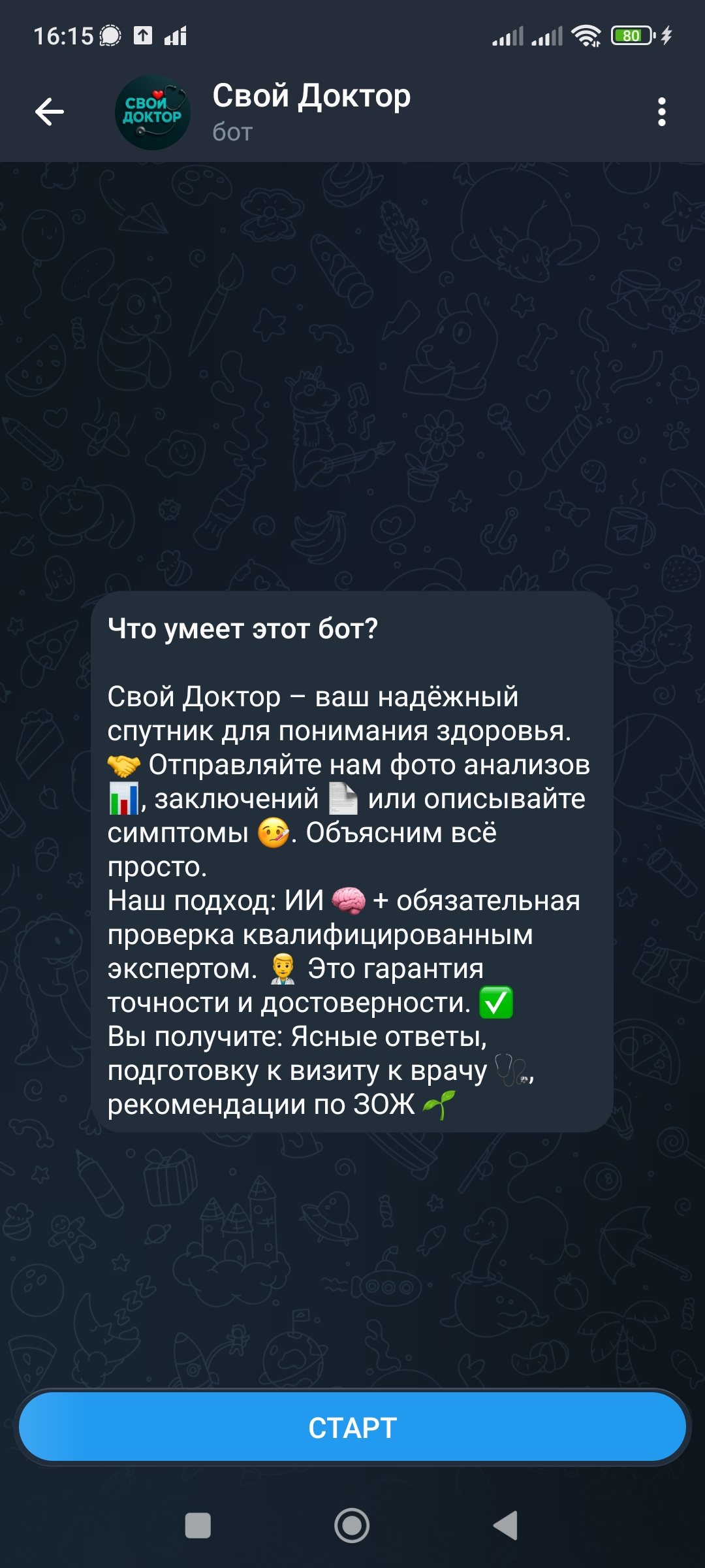 B2B-сегмент: Идеально подходит для интеграции в работу частных клиник. Бот может выполнять роль «цифрового ассистента», подготавливая пациента к приему и экономя время врача.