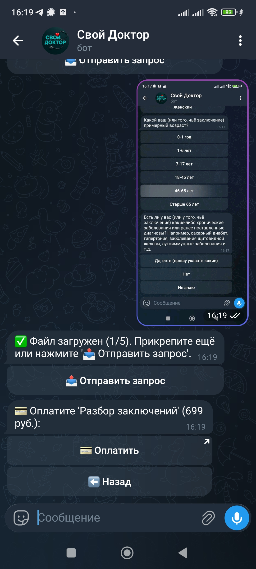 1. Telegram-бот (ссылка предоставляется по запросу): Уникальный сценарий интервью (~8 вопросов), прием до 5 мед. файлов (PDF/фото), автоматическая проверка оплаты.