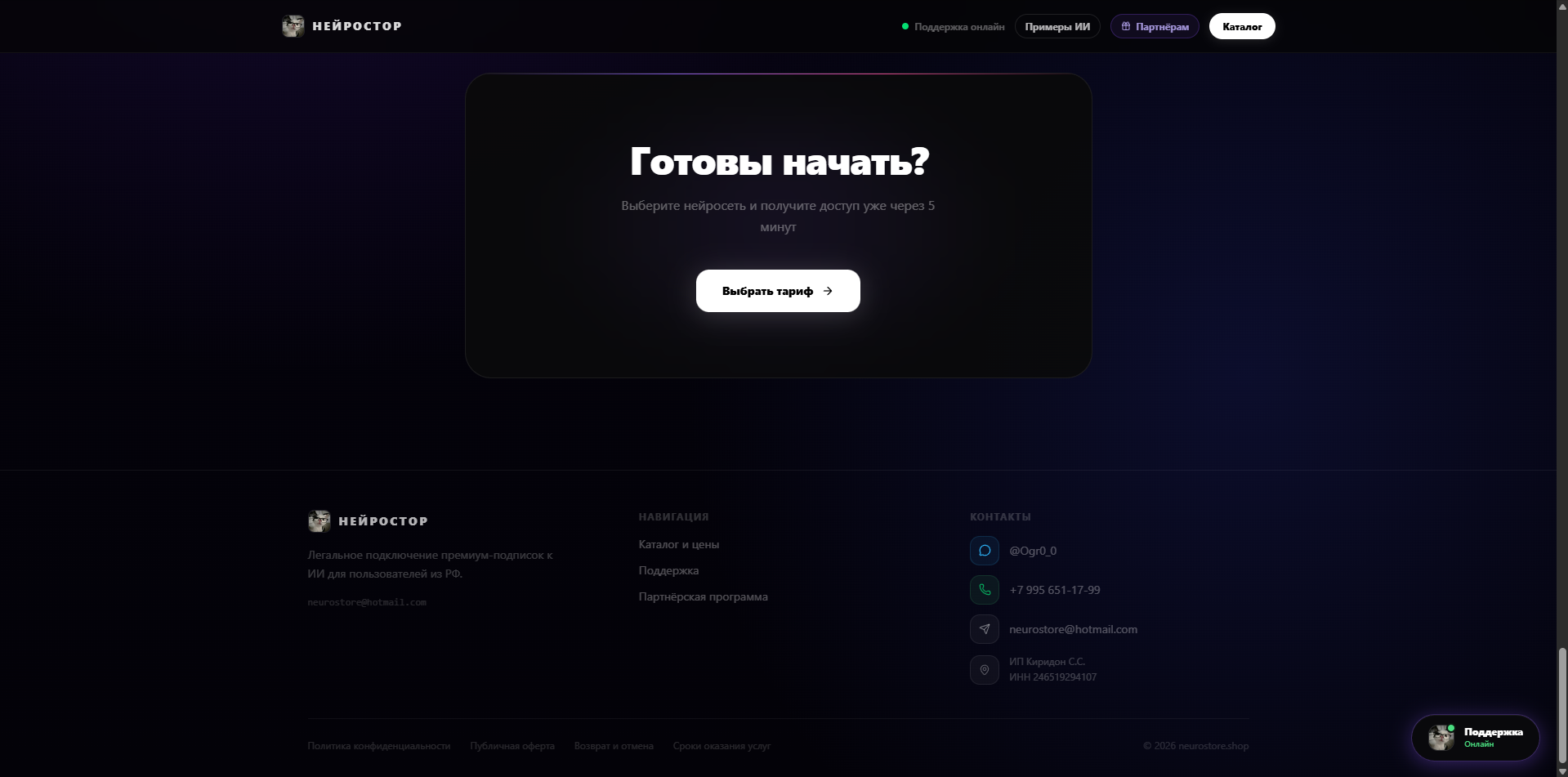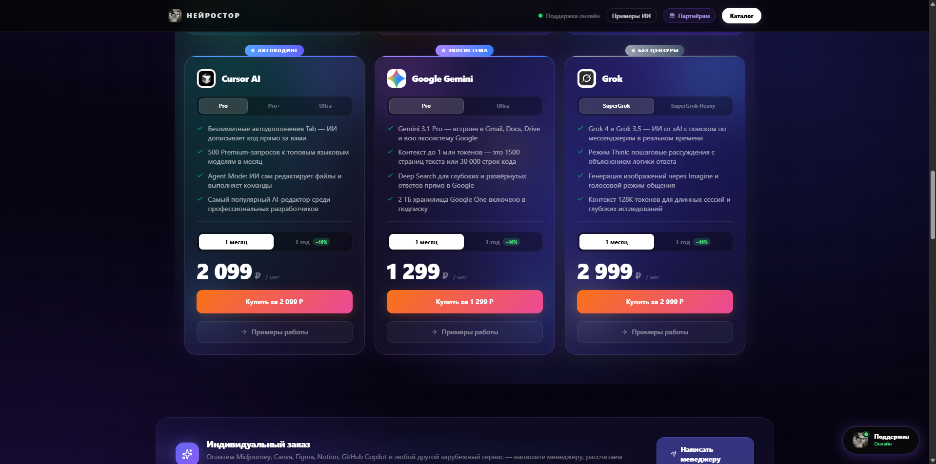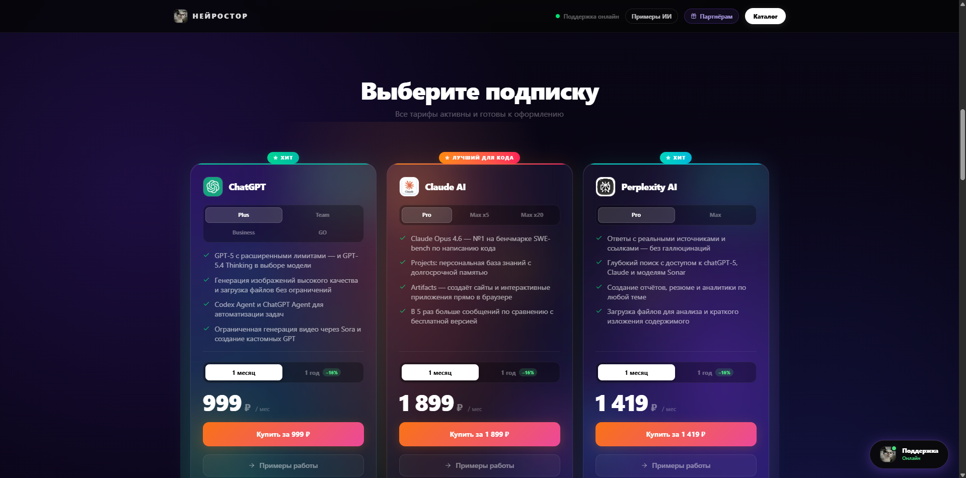 Интернет-магазин по продаже подписок на ведущие нейросети: ChatGPT (Plus, Team, Business), Claude (Pro, Max×5, Max×20), Cursor (Pro, Pro+, Ultra), Perplexity (Pro, Max), Google Gemini (Pro, Ultra), Grok (SuperGrok, SuperGrok Heavy).