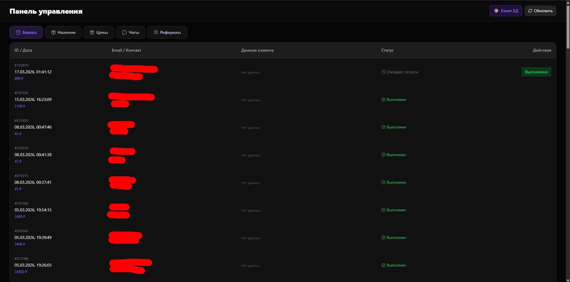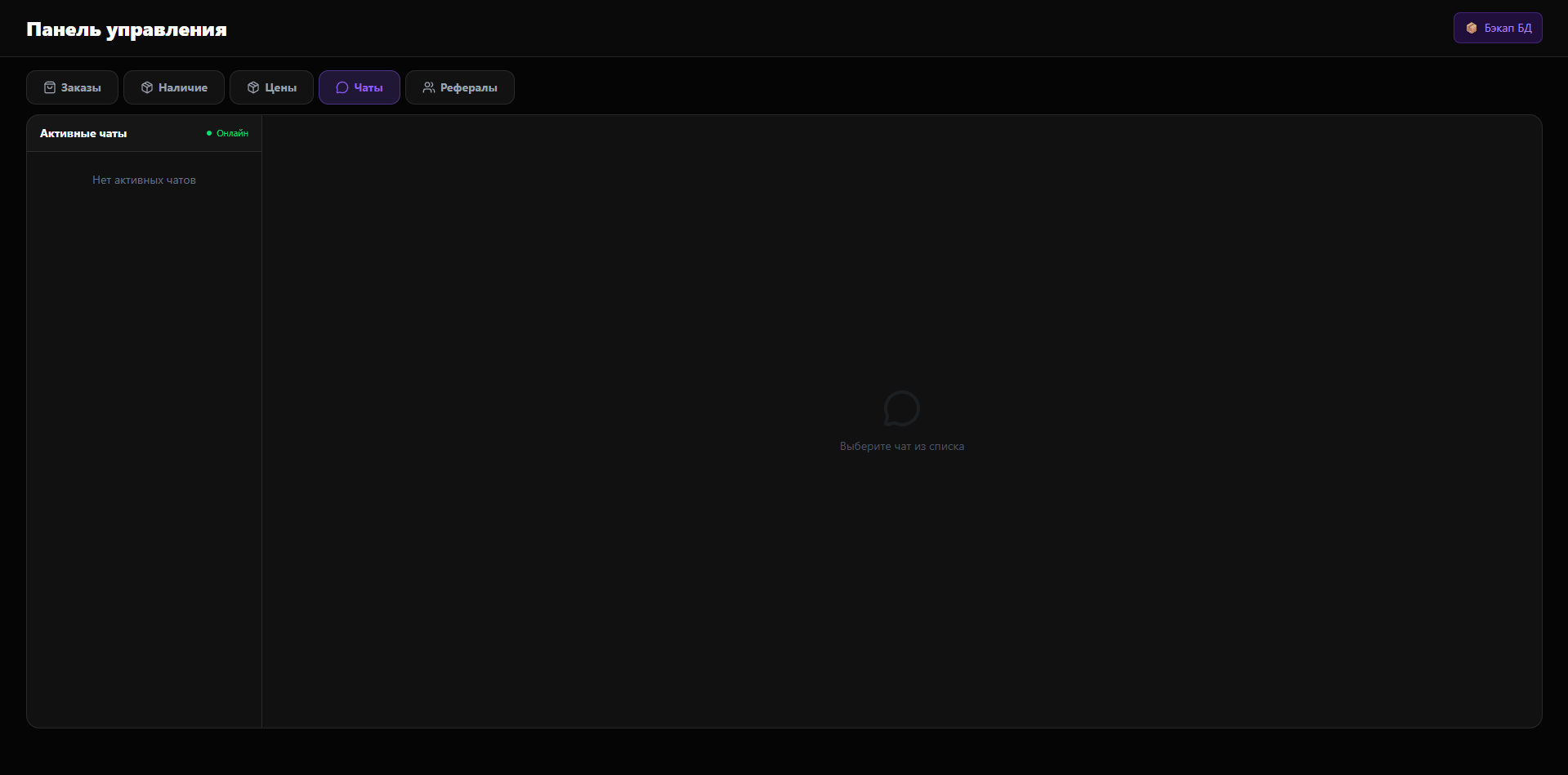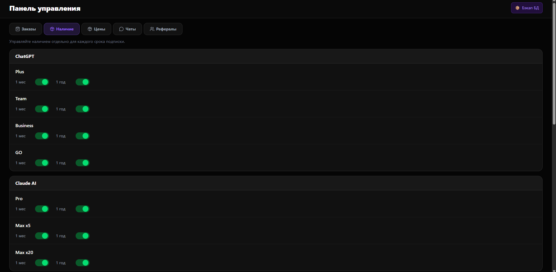 - Админ-панель для управления ценами, заказами,наличием подписок, рефералами, чатами