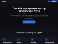 Сайт представляет собой онлайн-инструмент для автоматического сбора объявлений с Avito, позволяющий парсить до 5000 объявлений за одну сессию без установки программного обеспечения — все работает в облаке.