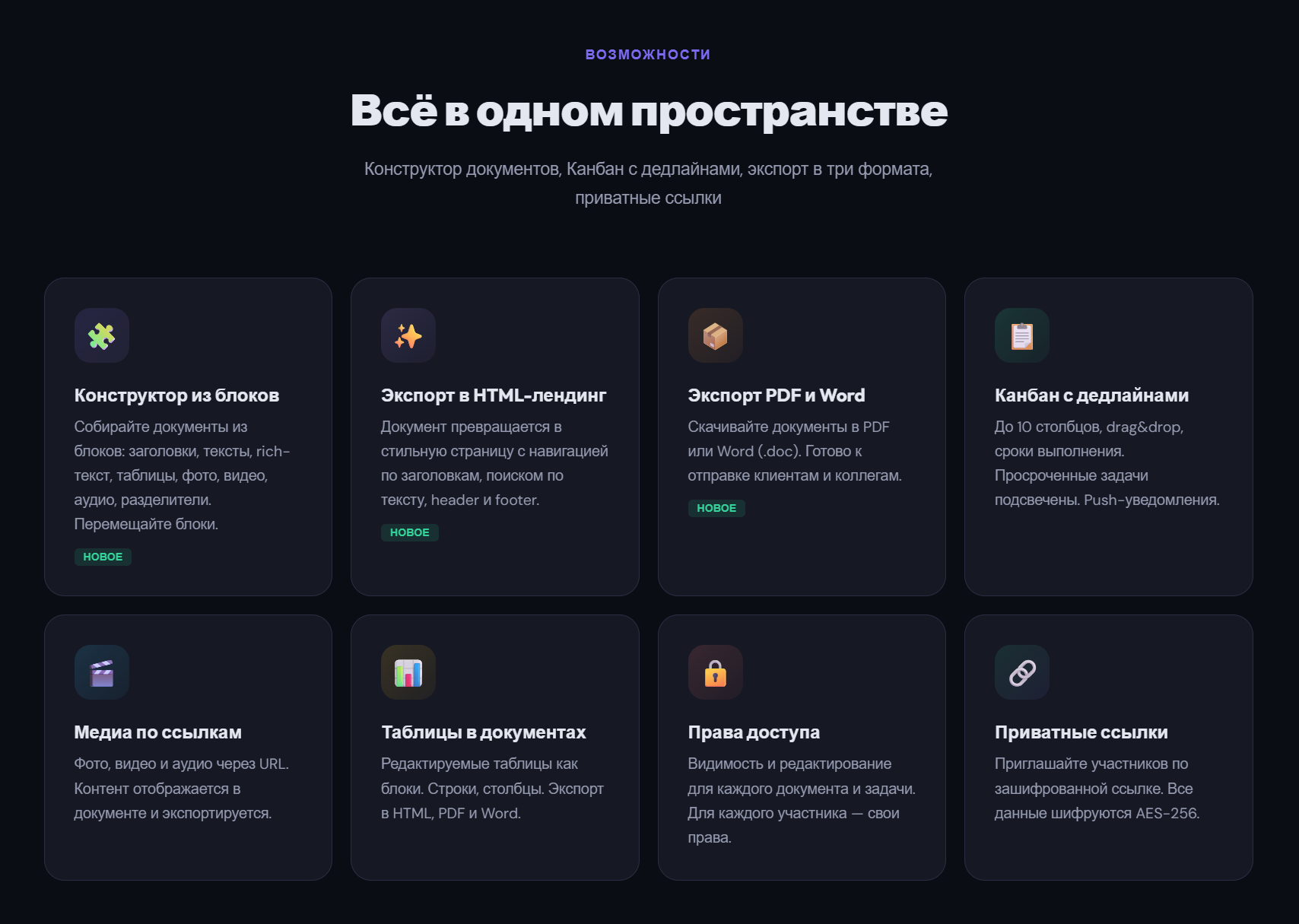Конструктор документов, Канбан с дедлайнами, экспорт в три формата, приватные ссылки