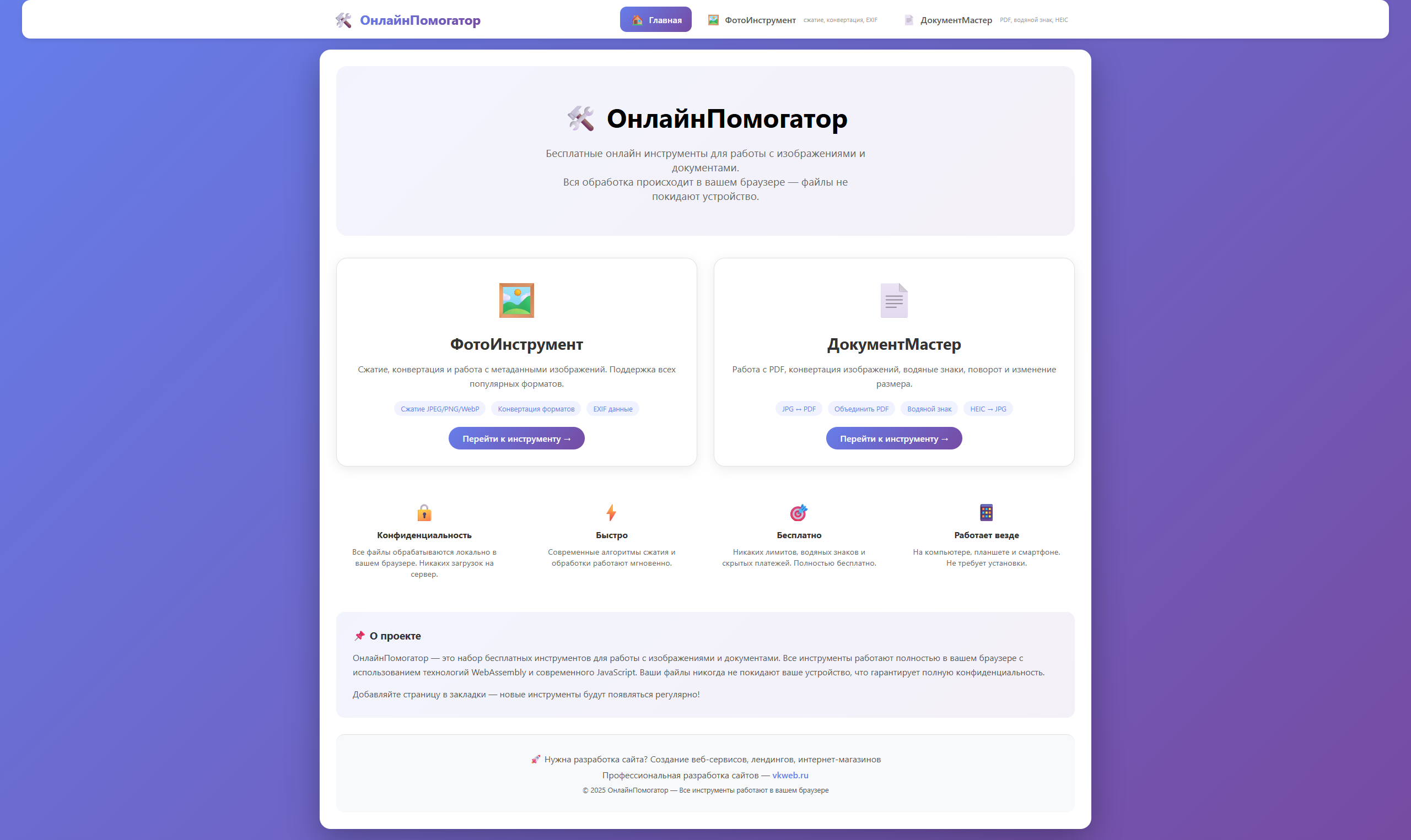 ОнлайнПомогатор - это набор из более чем 10 полезных инструментов для обработки изображений и документов (PDF, JPG, PNG, HEIC и др.).