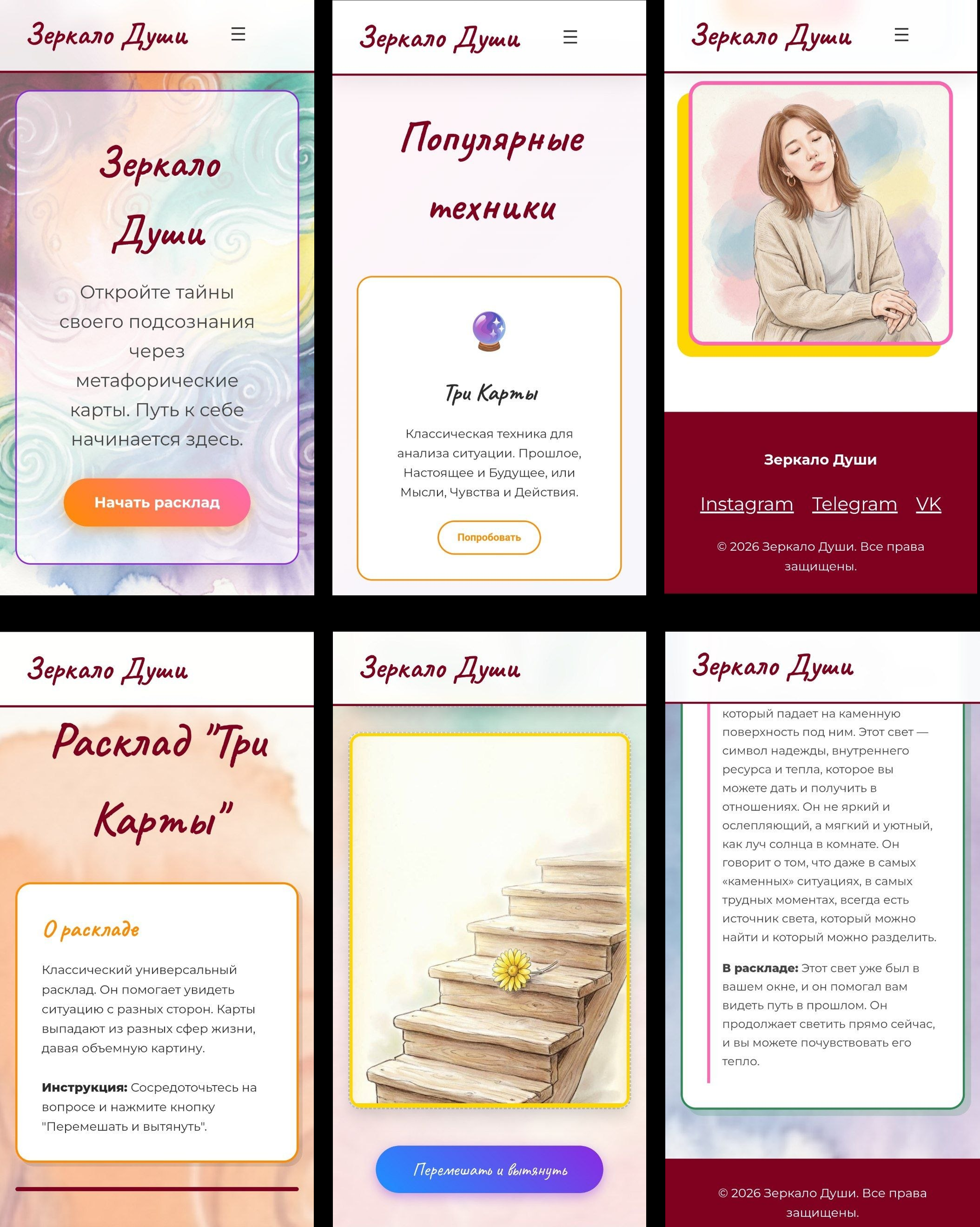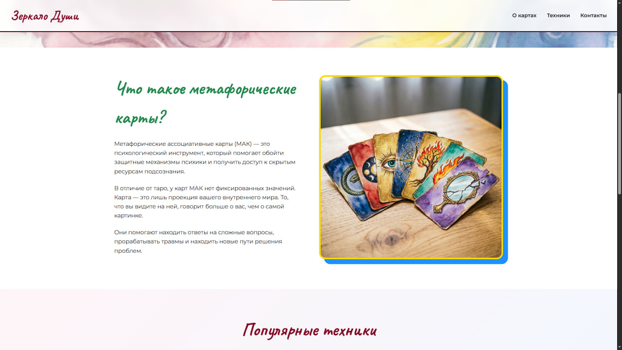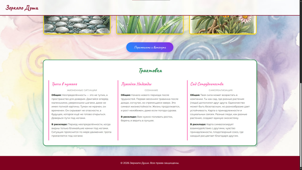 Авторская колода из 100 изображений — все карты созданы с нуля. Каждый образ уникален и не является стоковым. Вторых таких не найти: вместе с сайтом вы получаете исключительные права на единственную в своём роде метафорическую колоду, готовую к коммерческому использованию и монетизации.