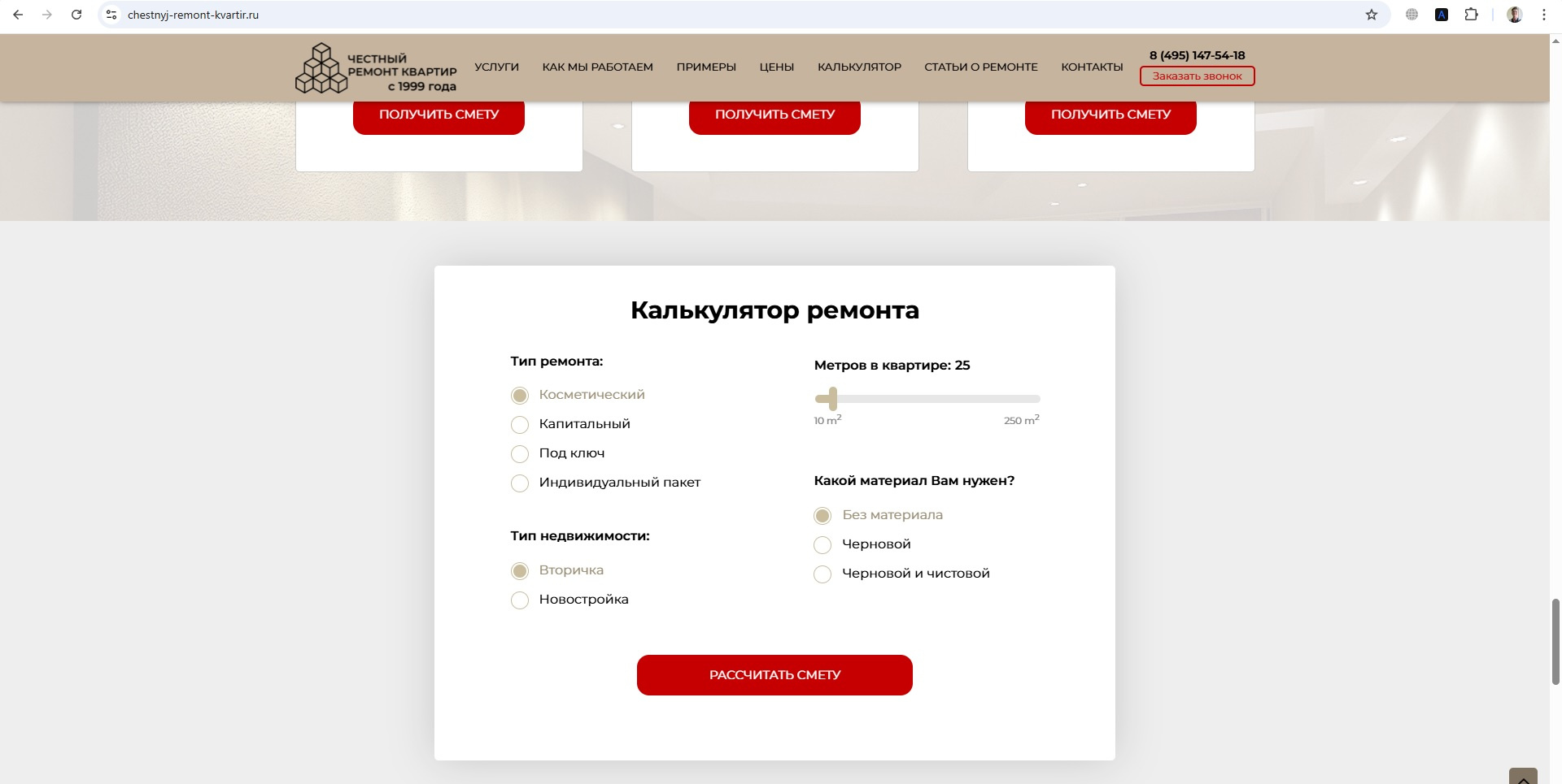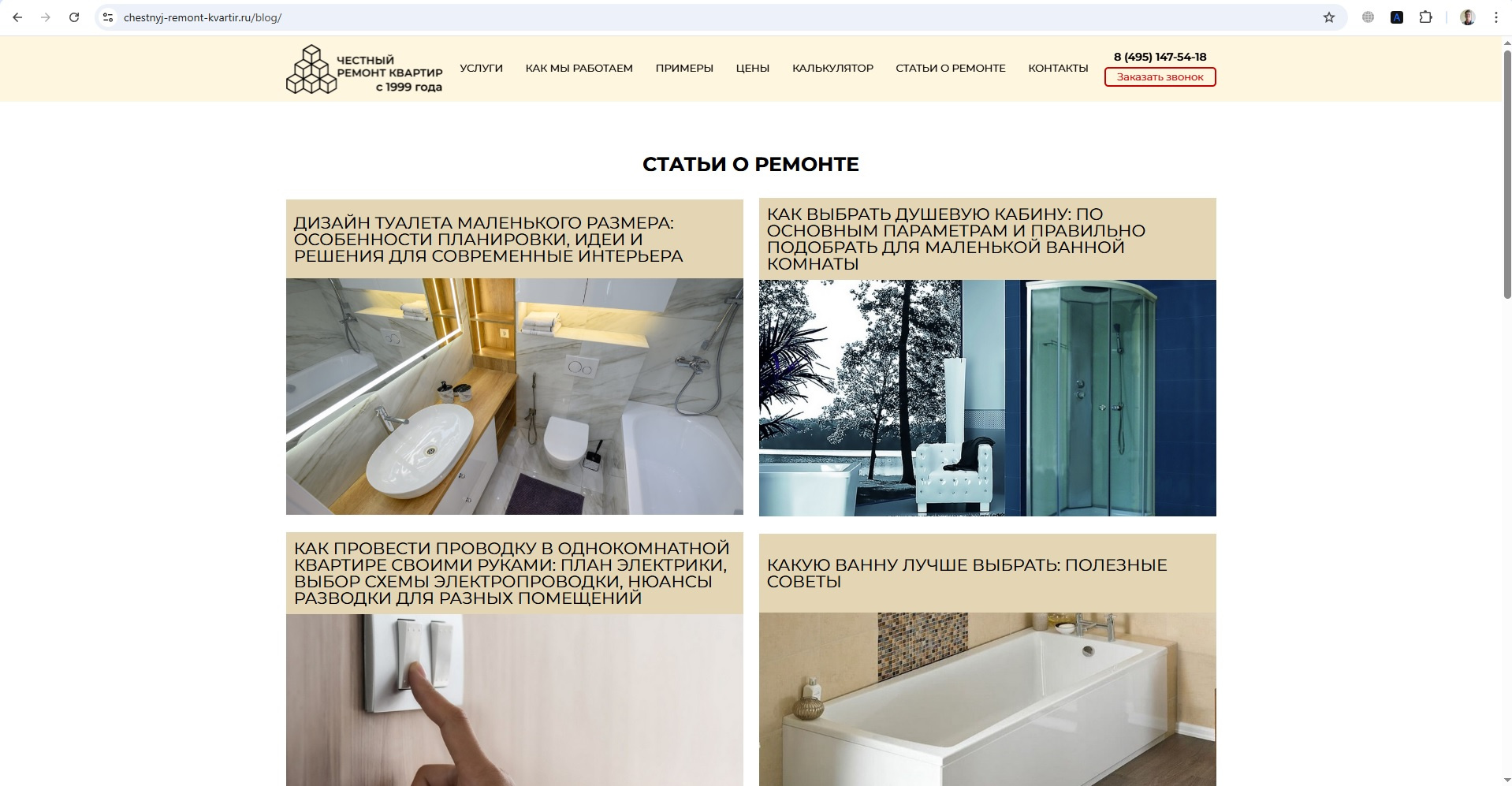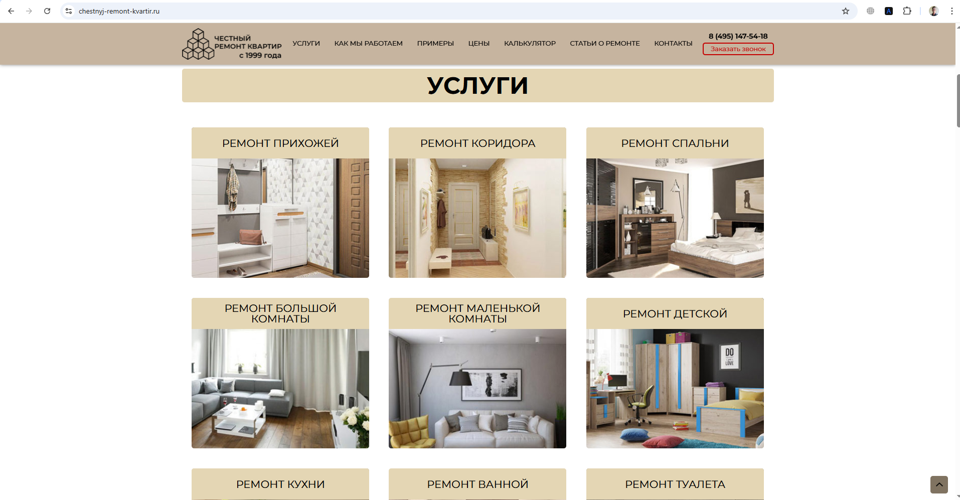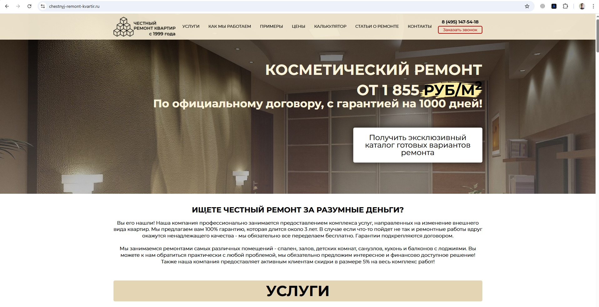 Сайт посвящен услугам по ремонту квартир, с акцентом на честный подход к работам, включая косметический, капитальный ремонт, отделку под ключ, работы в новостройках и по дизайн-проектам, что делает его узкоспециализированным ресурсом для тех, кто ищет надежных исполнителей в строительной нише.