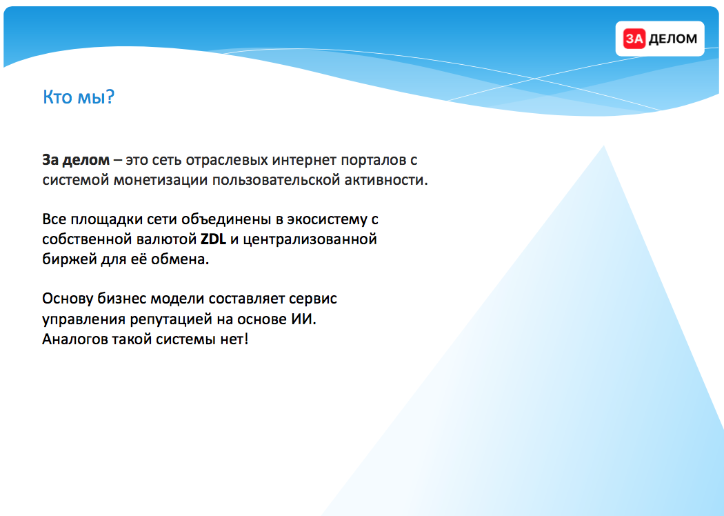 Инвестиции пойдут на: доработку портала, новый фронтенд, внедрение ИИ, мобильное приложение и собственная биржа для торговли внутренней валютой (ZDL) + запуск портала (реклама, бюджет для авторов и проф. копирайтеров). Смотрите презентацию на слайдах.