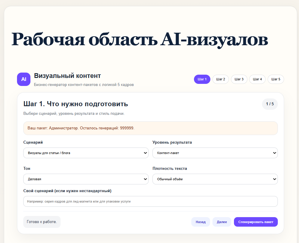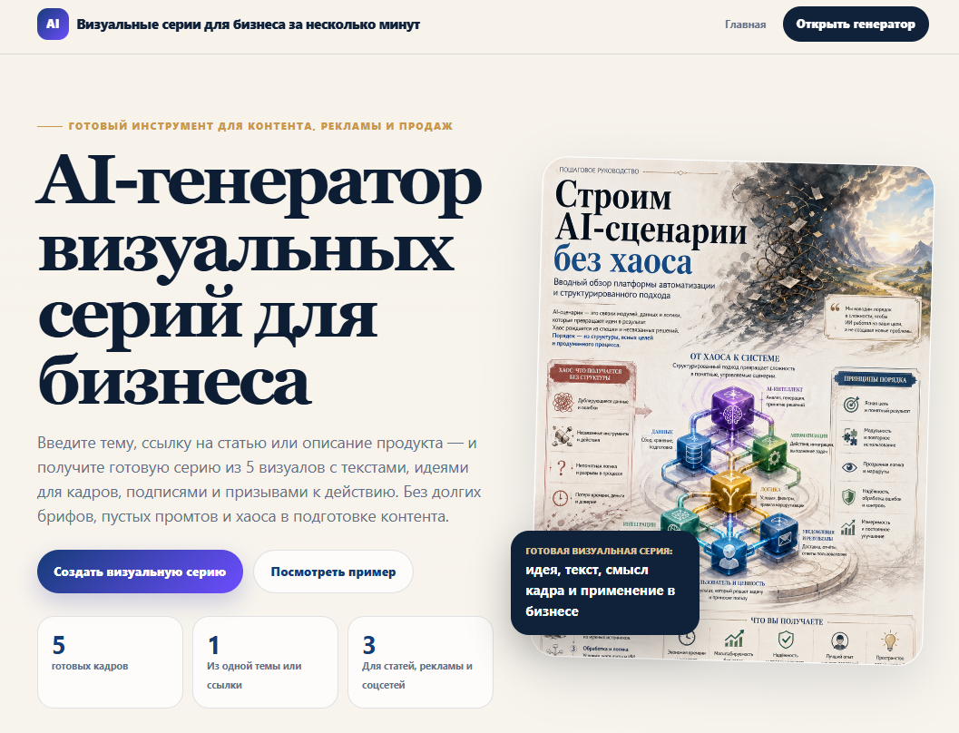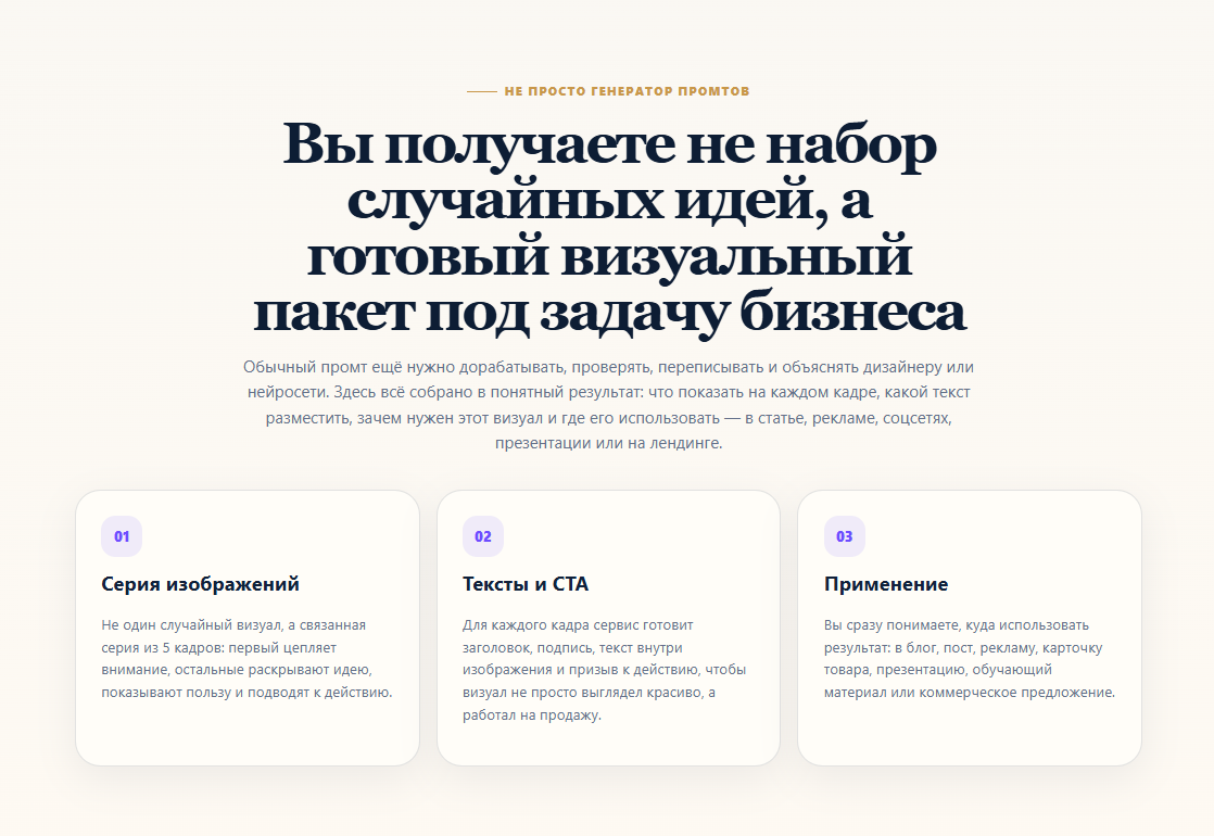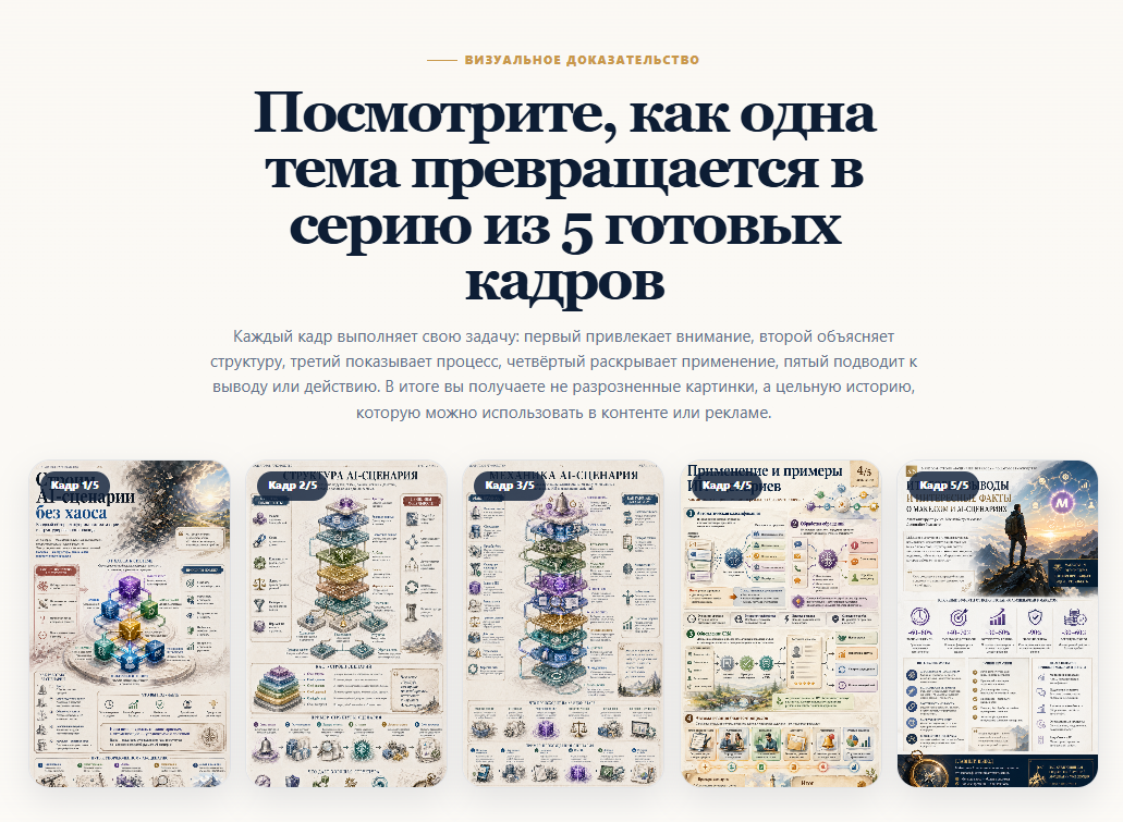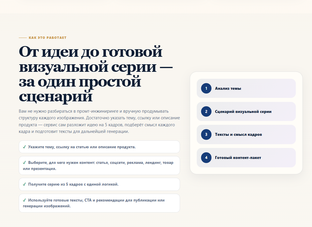 Проект создавался как быстрый коммерческий продукт: пользователь вводит тему или ссылку на статью, выбирает тип темы, формат изображения, стиль и получает серию из 5 готовых промтов, которые раскрывают тему через 5 кадров:
