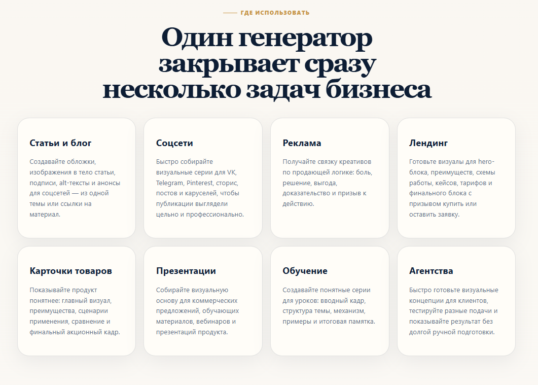 Такой формат удобен для предпринимателей, маркетологов, SMM-специалистов, авторов блогов, агентств, владельцев Telegram/VK/Дзен-каналов, экспертов и небольших студий, которым нужно быстро получать визуальные идеи, промты, обложки, карточки, презентационные изображения и контент-серии.