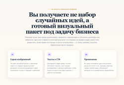 Главное преимущество проекта — он закрывает понятную боль бизнеса: большинству предпринимателей уже нужны изображения и визуальные материалы, но они не умеют писать качественные промты, не понимают структуру серии, не знают, как получить единый визуальный стиль и тратят много времени на хаотичные попытки.