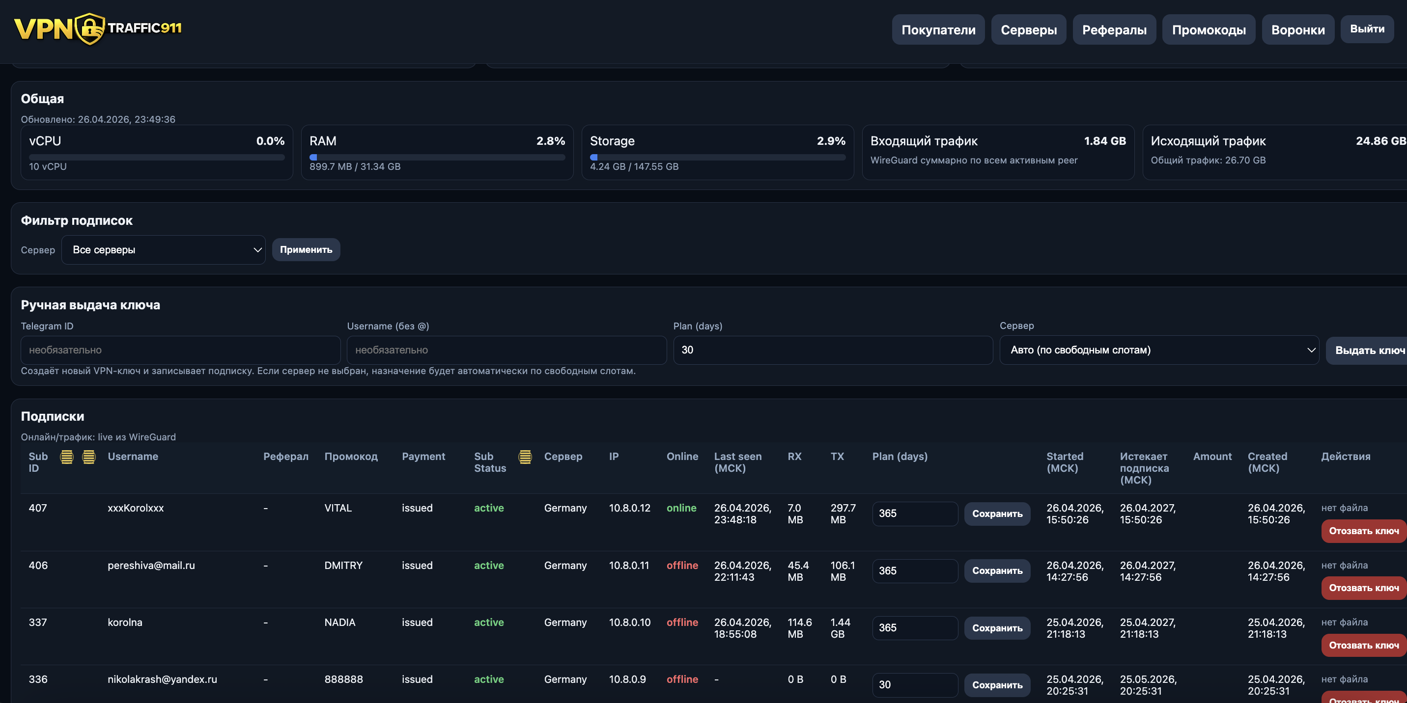 TRAFFIC911.ru VPN — готовый бизнес под ключ (бот + сайт + админка + серверная часть)