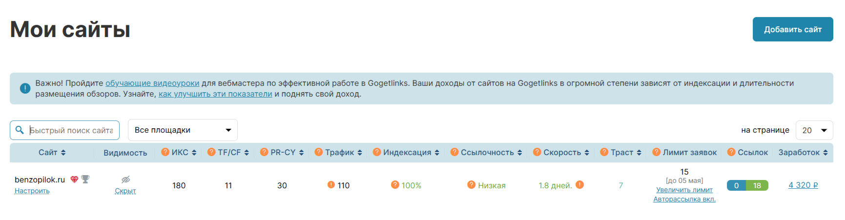 Пробовал добавлять сайт в GoGetLinks, заявки поступали в большом количестве, цены поставил намного выше рекомендуемых, за пару месяцев немного опубликовал ссылок, чтобы показать, что на этом сайте очень хорошо продаются ссылки. Теперь реклама стоит на паузе. Передача сайта в сервисе GoGetLinks.net новому владельцу является обязательным условием при продаже.