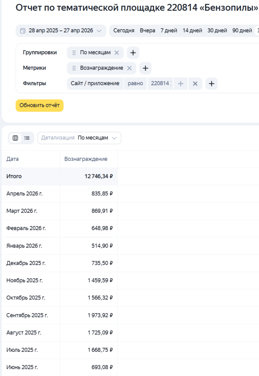 Плюсом сайт долгие годы зарабатывает в РСЯ, пережил кучу фильтров, в том числе и последние. Тематика сайта сезонная, летом доход будет значительно выше, смотрите скриншот по доходу в РСЯ.