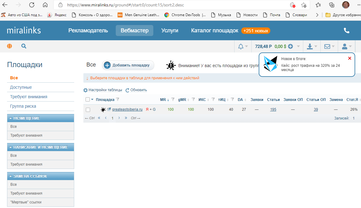 Затраты были только на хостинг и размещению статей, написанных мною же, на бирже Miralinks.