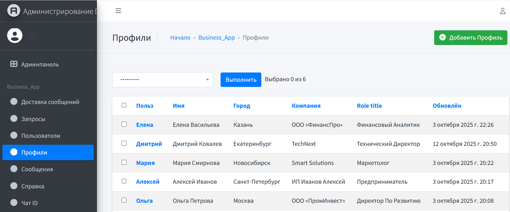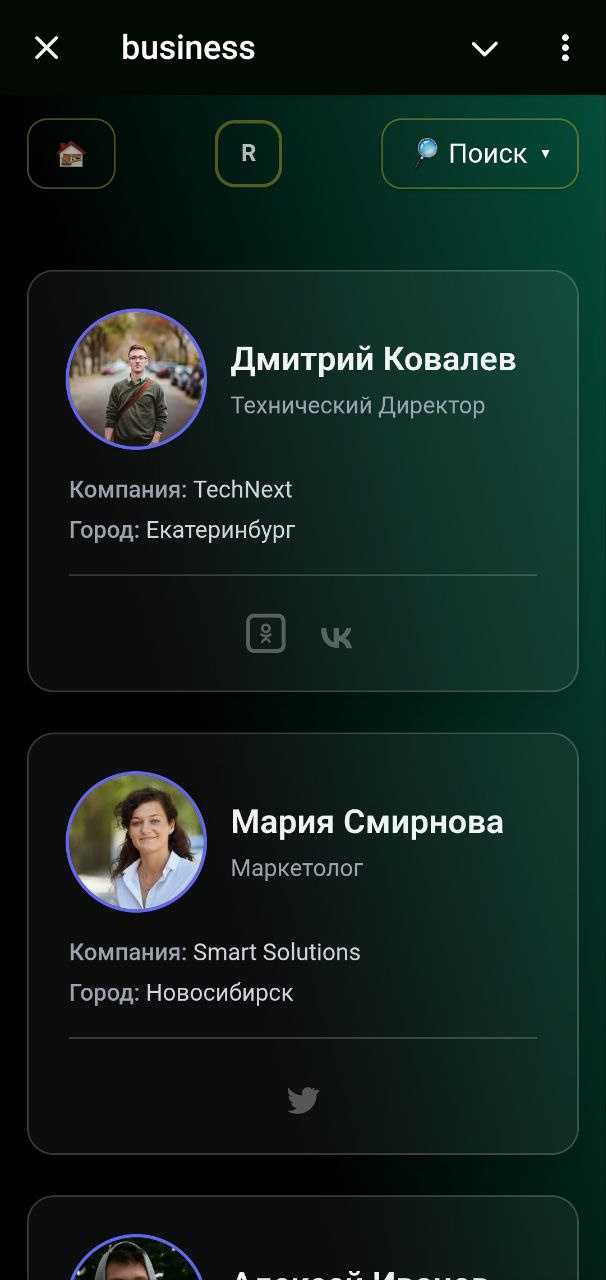 Профили участников (город, бизнес, роль, контакты).