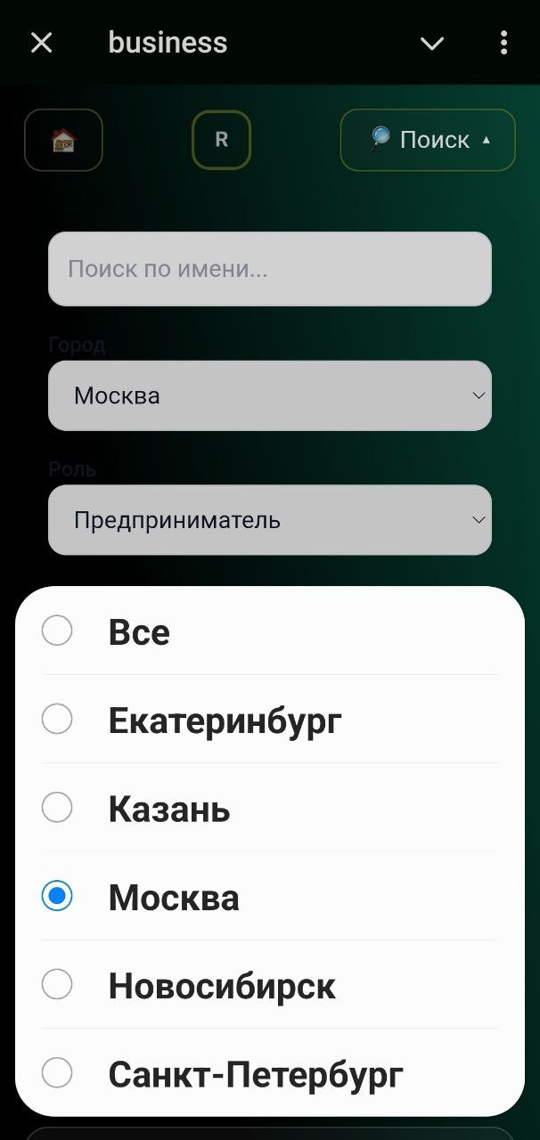 - Кнопка «Фильтры»: поиск по имени + город (выбор), роль (выбор).