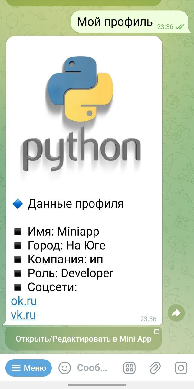 - Мой профиль (/profile) → показывает карточку профиля + кнопки «Редактировать» / «Открыть в Mini App».