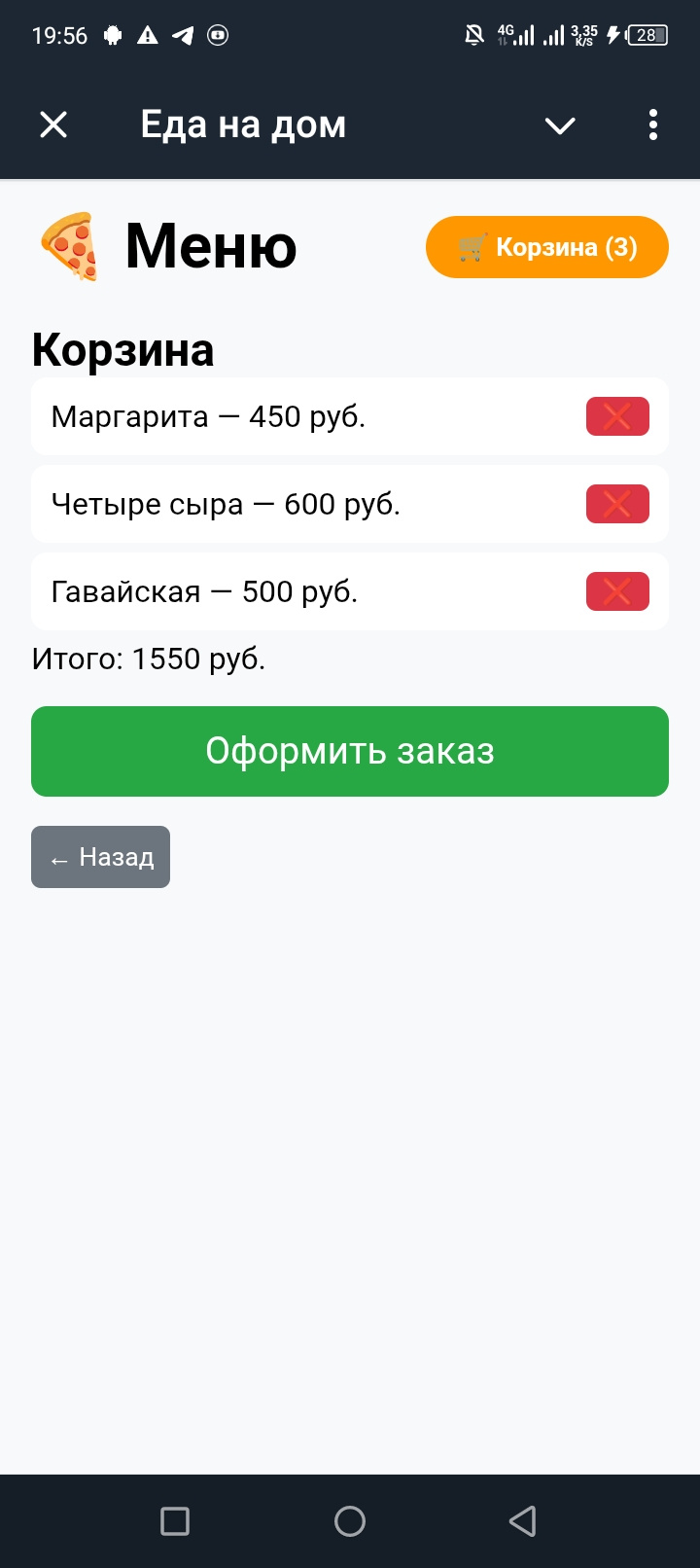 - Оформление заказа с указанием адреса, телефона и геолокации.