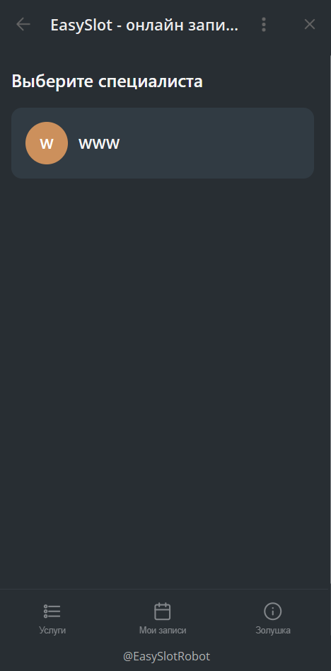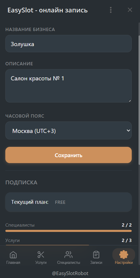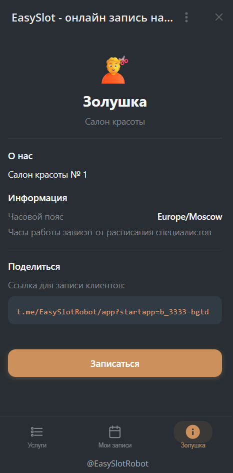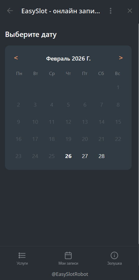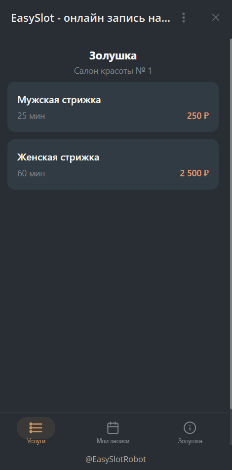 EasySlot — это онлайн-система для записи клиентов через Telegram, которая подходит для салонов красоты, барбершопов, массажных студий, стоматологий, автосервисов, коворкингов, фотостудий и других услуг.