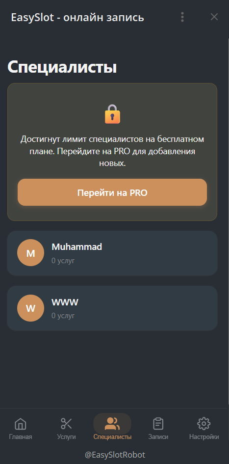 - Бесплатный (FREE): базовый функционал с ограничениями на количество мастеров, услуг и записей.