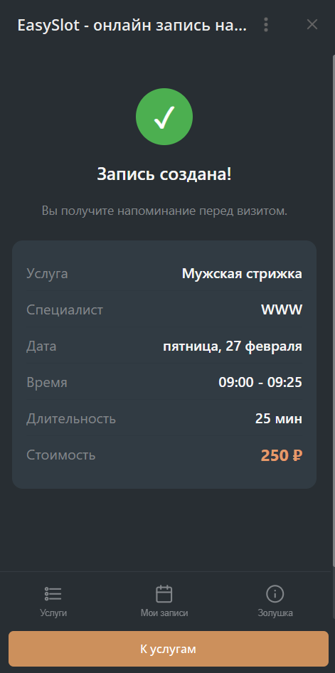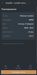 - Удобный интерфейс для записи, который состоит из 4 шагов: выбор услуги, мастера, даты и свободного времени. После этого нужно подтвердить запись.