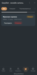 - Просмотр и управление записями клиентов, подтверждение, отмена и завершение услуг.
