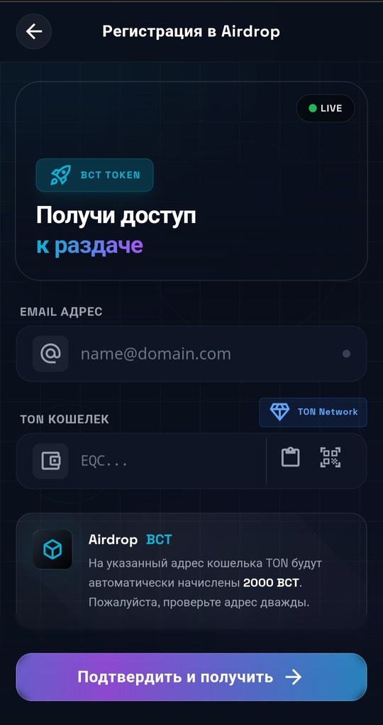 2. Введи Email и адрес TON-кошелька (просто скопируй и вставь)
