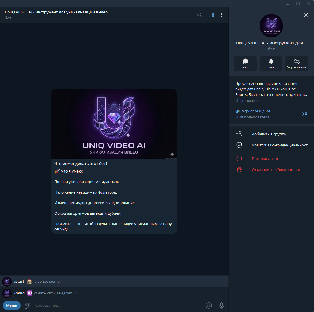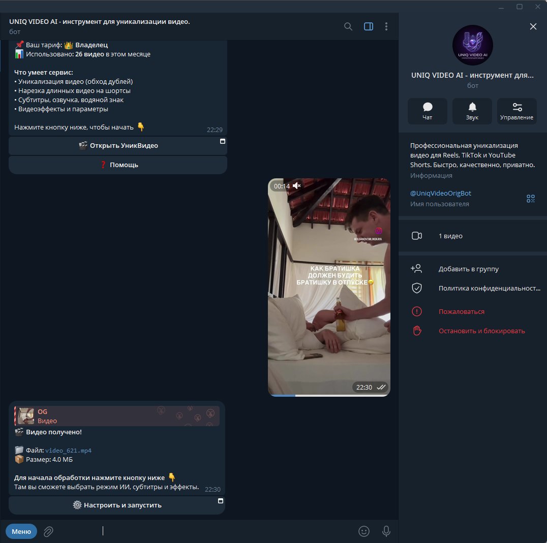 Глубокая уникализация: Техническая часть продукта заточена под обход алгоритмов (YouTube, TikTok, Instagram). Бот автоматически: — Очищает метаданные, меняет хеш-суммы файлов. — Применяет пакет эффектов: зеркалирование, коррекция цвета/зернистости, микро-зум и изменение скорости кадра. — Это позволяет заливать контент массово, минуя «Теневой бан» и детекторы дубликатов.