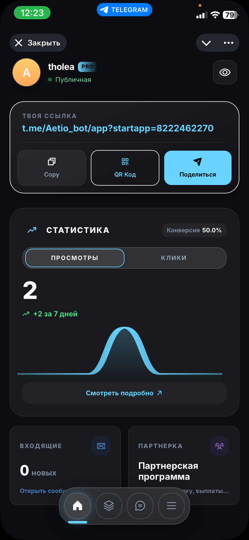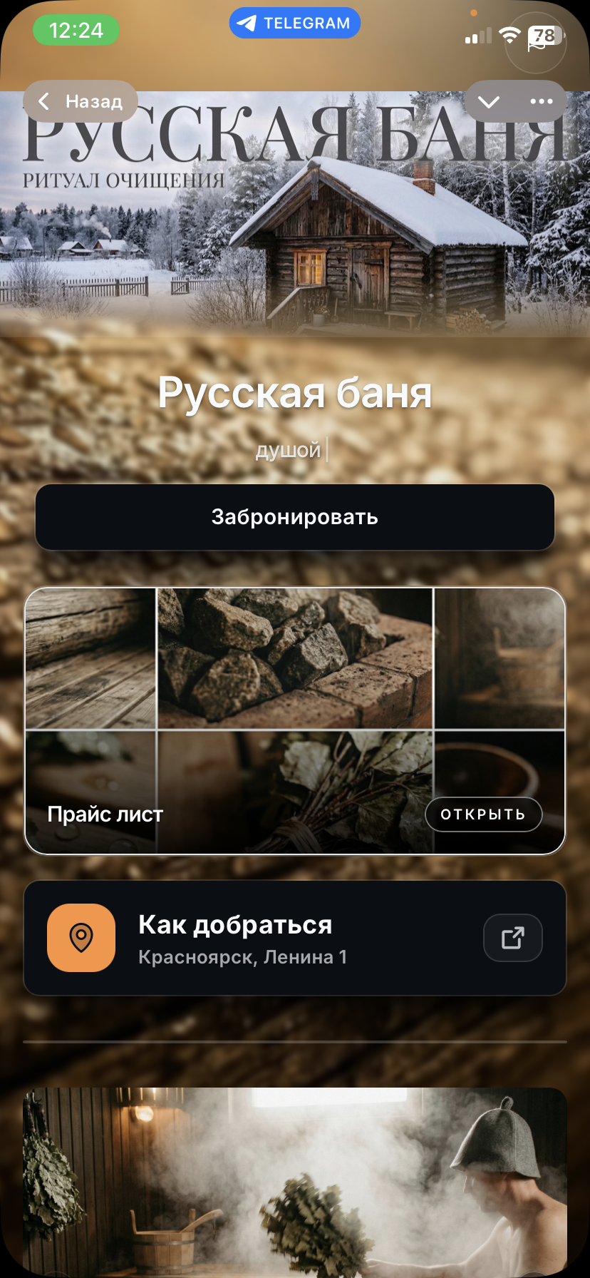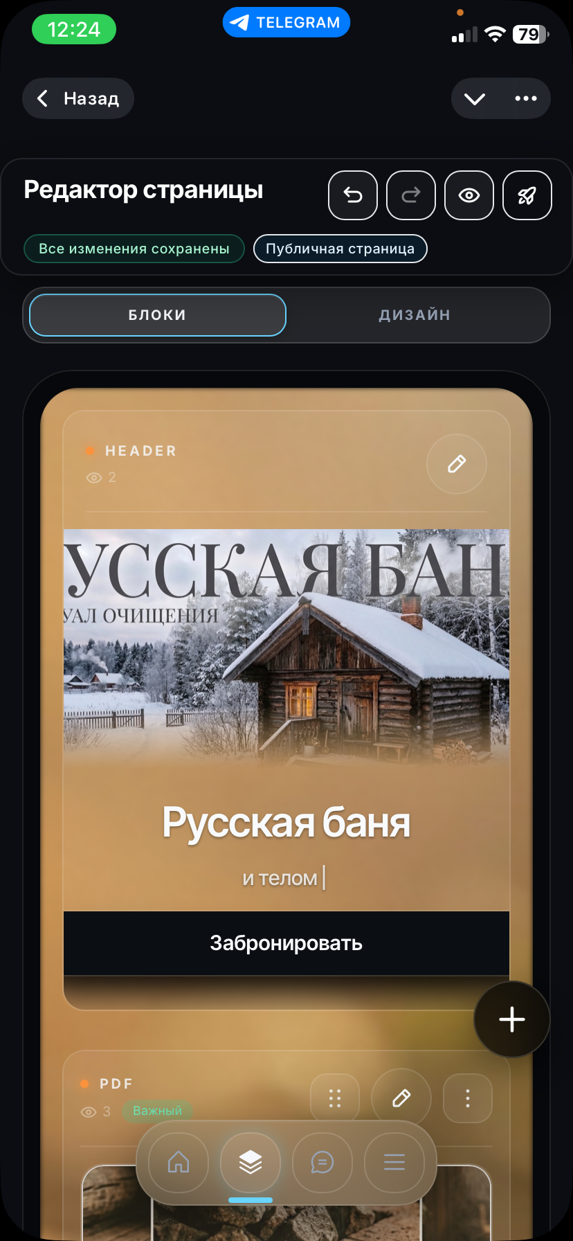 То как видит пользователь созданную страницу , когда переходит по личной ссылке или QR коду (легкое демо по оффлайн бизнесу бани ) : https://t.me/Aetio_bot/app?startapp=8222462270