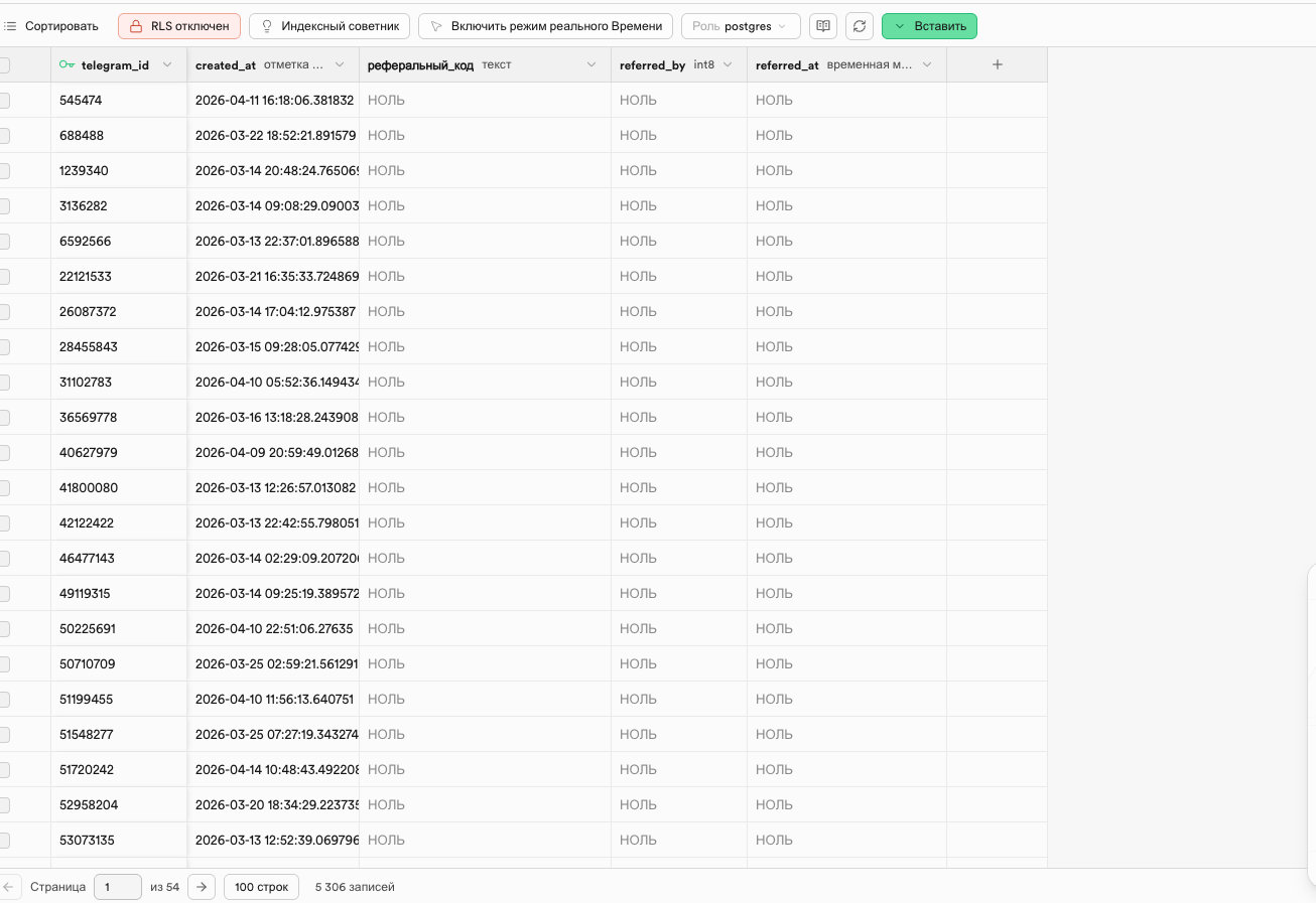 — база пользователей/статистика в рамках возможностей Telegram и проекта;