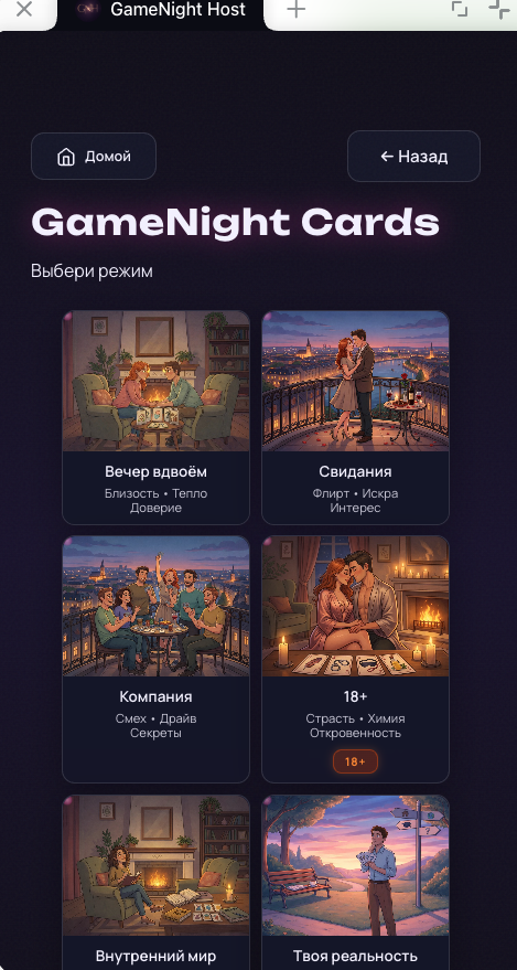 GameNight Host — это мини-приложение в Telegram с подборками карточных игр и вопросов для разных сценариев: для компании, для пары, для вечеринок, для лёгкого общения и саморефлексии. Пользователь открывает бота, запускает Mini App и сразу может выбрать игру/колоду.