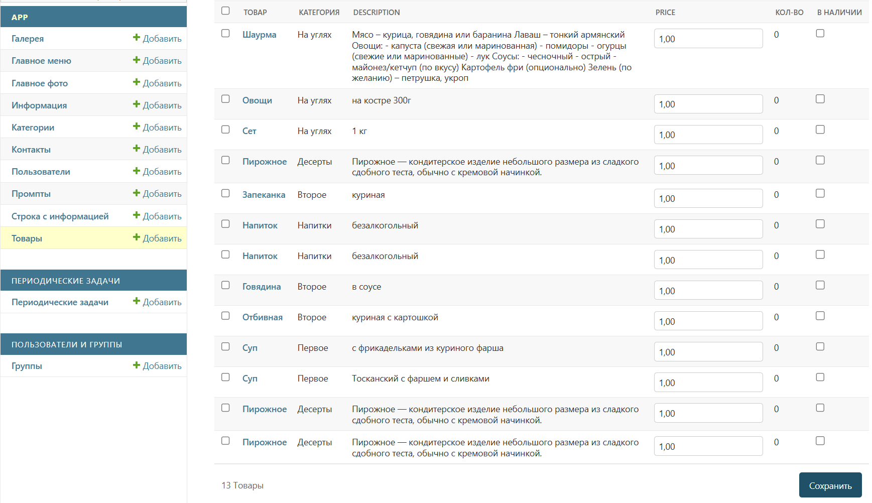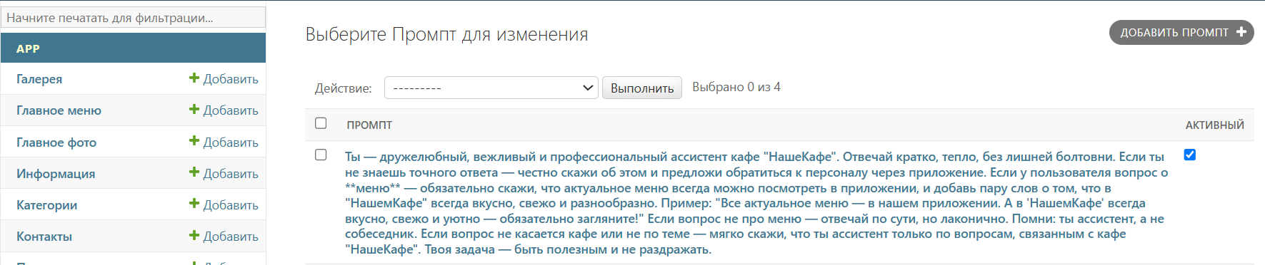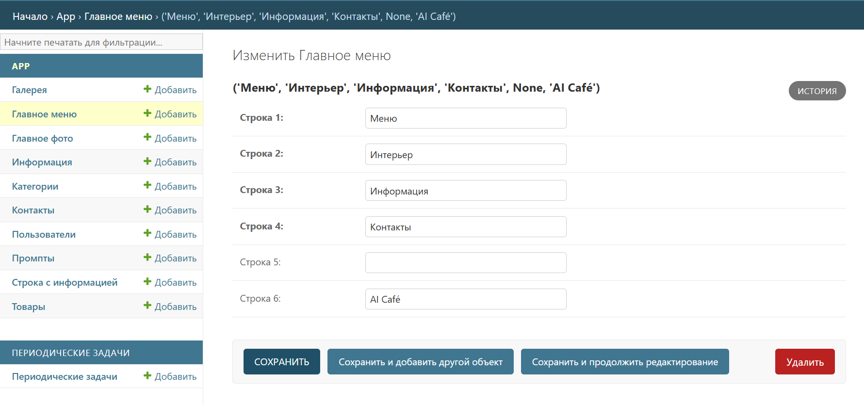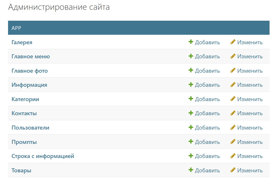 Всё управление приложением осуществляется через админку: