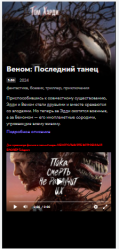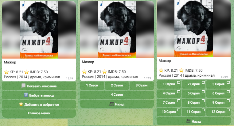 ✓ Полностью автоматизированная работа, контент сам обновляется и добавляется из открытых источников по запуску файла из Cron задачи раз в день. Видеоматериалы загружаются на сервера Телеграм, что позволяет просмотр не покидая приложения. Если у фильма нет видеоматериала, то запускается файл на закачивания видео в 3 разрешениях(SD. HD. FullHD) и при следующем обращение к этому фильму уже отдается просмотр в ТГ иначе открывается браузер с страницей просмотра данного фильма. Фильмы грузятся в 3 качествах, а сериалы в одном (SD). Если сериал популярный и имеет большой охват просмотров, то возможно запустить скрипт в терминале для закачки оставшихся 2 качеств.