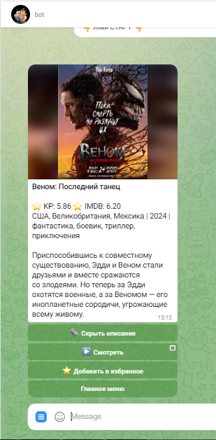 Этот проект — как билет на Титаник… Только вы можете успеть на борт до того, как волна киномании накроет рынок. При должном маркетинге уже через месяц ваш бот может стать новым "КиноПоиском" в Telegram!