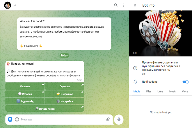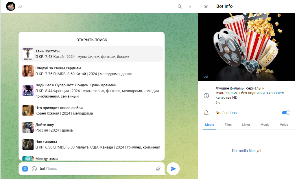 ✓ Автопостинг, закладки, реферальная программа, ежедневные обновления, умный поиск и огромный выбор на любой вкус и цвет. Поиск фильмов возможен как в боте так и в любом личном чате, группы и канала.