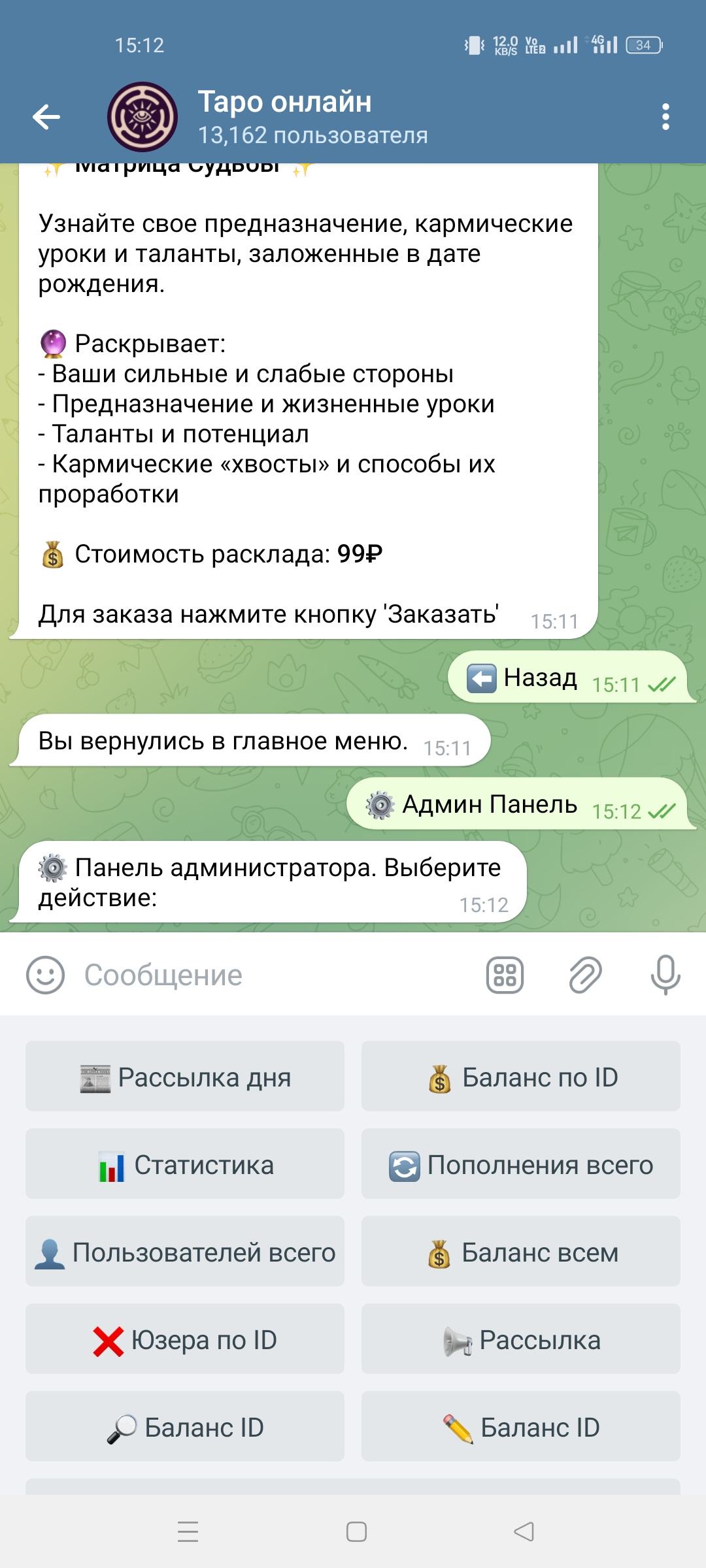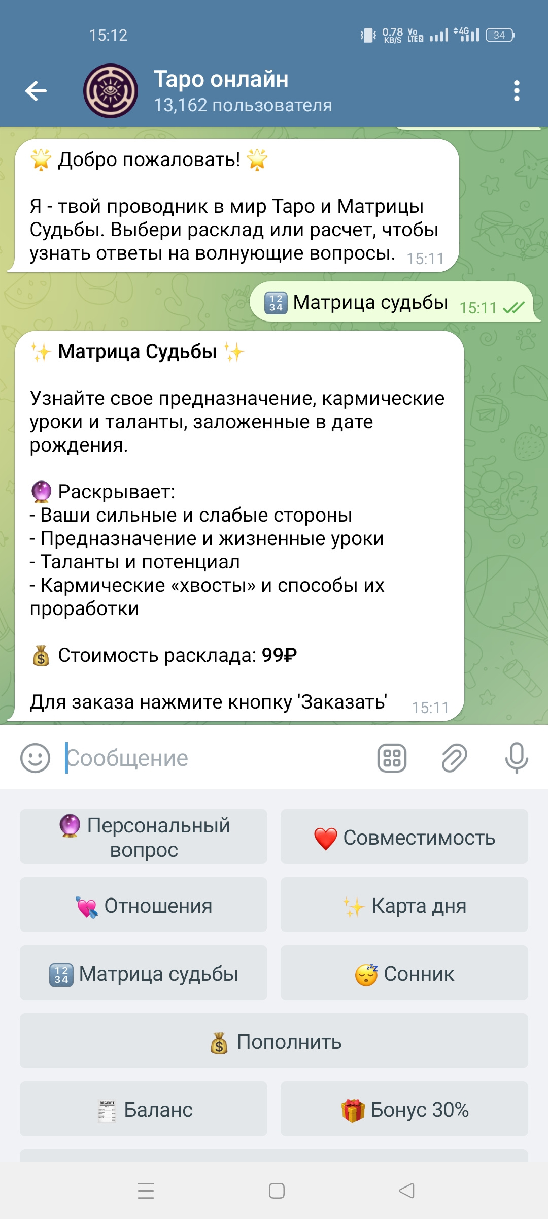 Бот раскладов Таро с интерпретацией через chat gpt 4o. Множество раскладов с красивым оформлением. Находится в ТОП 1 в поисковой выдаче по запросу "таро онлайн" все покупки с органики. В день от 300 до 900 рублей, при активной раскрутке плюсом к органик будет идти и рекламный трафик с покупками. Помимо таро имеется матрица судьбы и сонник. Все функции платные прикручена юкасса с выдачей чеков.