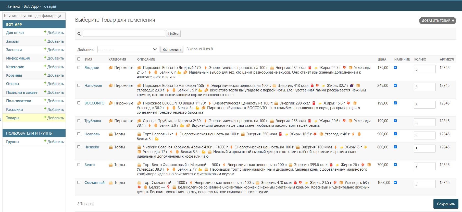 ✅ Возможность просмотра, изменения и отката заказов, товаров и остатков.