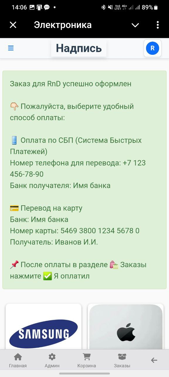- Подтвердить оплату — пользователь нажимает кнопку, администратор получает уведомление