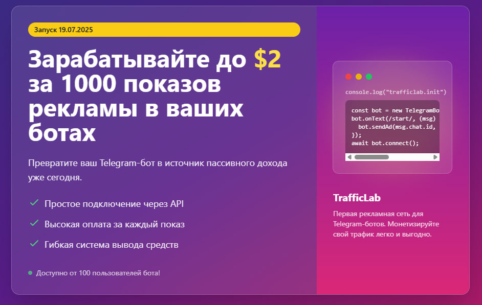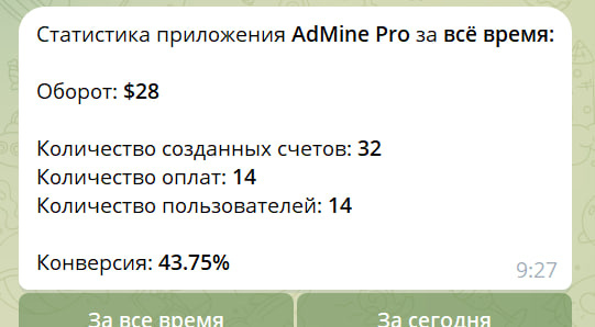 В боте для админа есть еще одна приятная плюшка для заработка - возможность пользователям купить рассылку сообщения по всем пользователям всех ботов в вашей системе. Цену на 1 устанавливаете Вы. Например 50 копеек 1 сообщение, у вас в системе 30 ботов в среднем по 200 человек в каждом = 6000 человек * 50 копеек = 3000 рублей рассылка. Эта цифра будет расти прогрессивно - чем больше ботов в системе, тем больше пользователей в общей базе ботов. Продавайте сколько хотите в день, все заявки на рекламу проходят модерацию админа. Все автоматически от заявки до оплата, только модерация. Можно посмотреть в нашем боте реализацию.