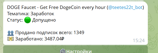 1. При входе в бота и при сборе крипты, пользователь должен подписаться на каналы спонсоров. Каналы спонсоры поставляет наш партнер SubGram (На скринах есть доход от этого сервиса). Мы рекомендуем ставить не более 2-х каналов в блок, минимум оплата с канала 0,8 рублей х2 = 1,6 р. При сборе получается 1,6 - 0,5р(столько отдается при бесплатном сборе) = 1,1 минимум прибыль с 1 сбора 1 человека. Цена подписки зависит от настроек спонсорского канала и может быть более 7 рублей за 1.
