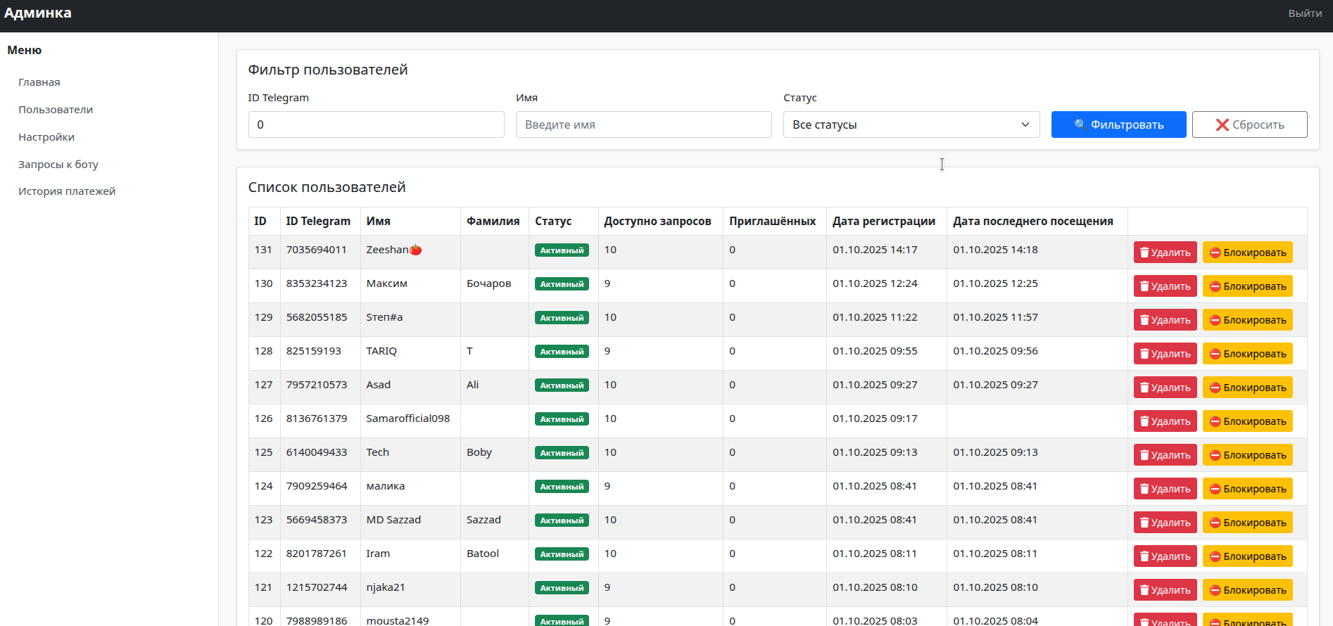Список пользователей с возможностью фильтрации, блокировки и удаления.