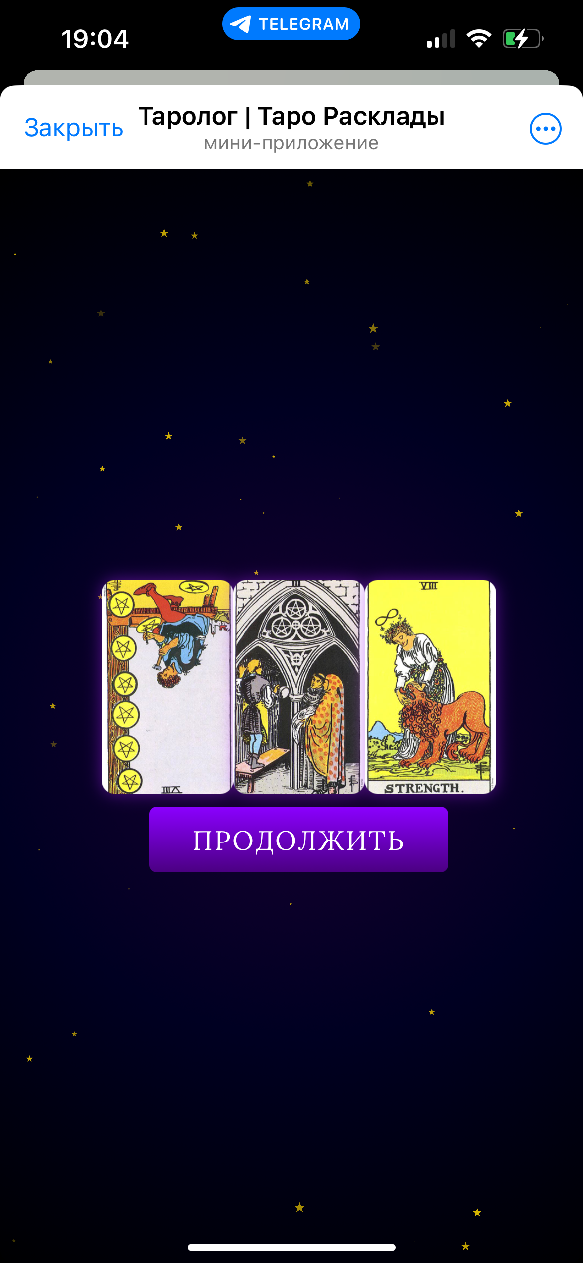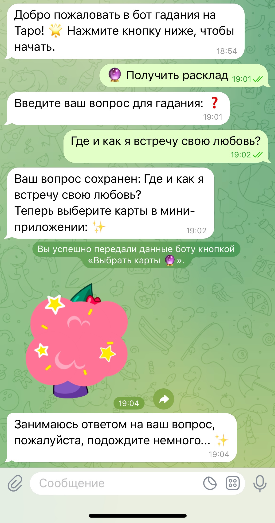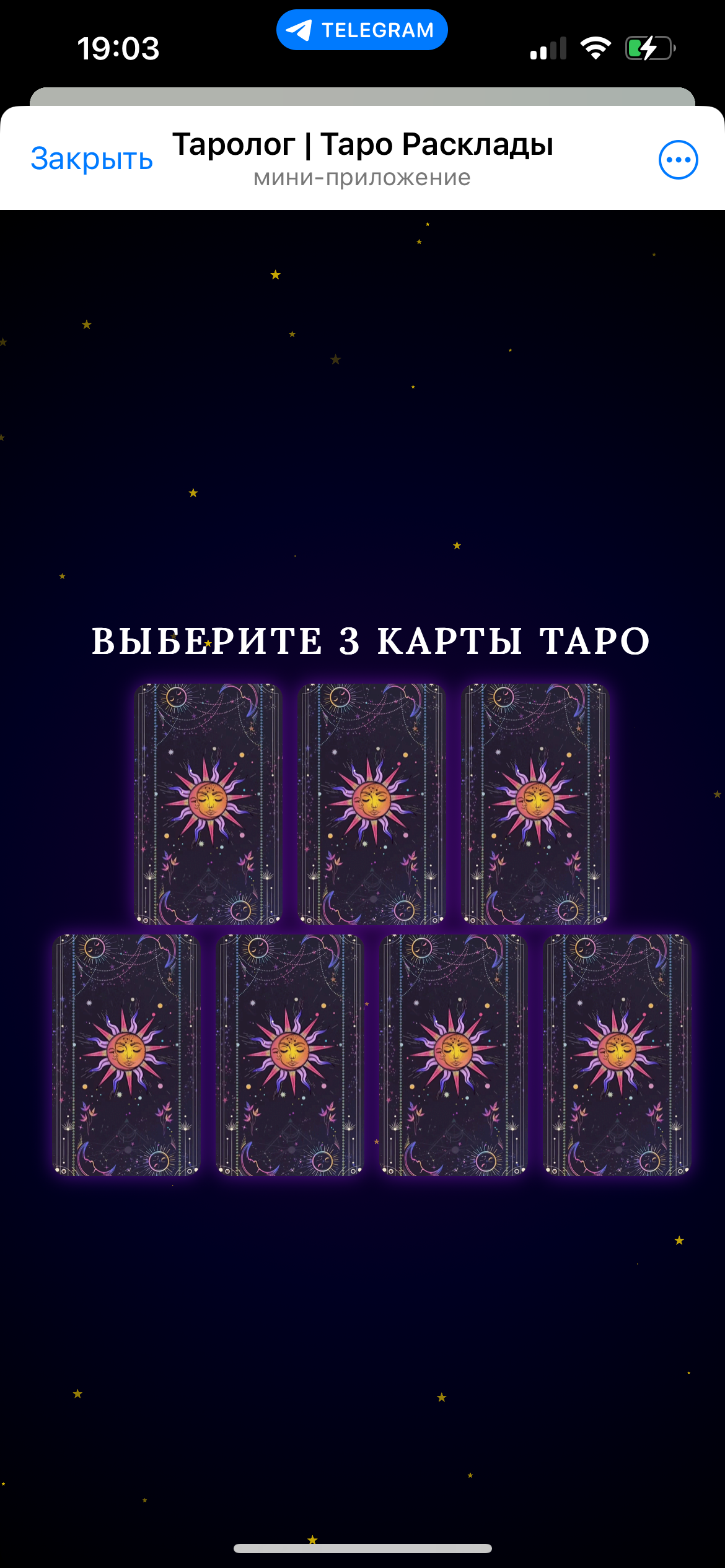 Расклады: Задай вопрос, выбери 3 карты в супер-красивом мини-app (анимации, GIF-эффекты — карты переворачиваются, светятся) AI генерирует детальную интерпретацию (прошлое-настоящее-будущее, советы). Лимит: 3 бесплатно, потом премиум.