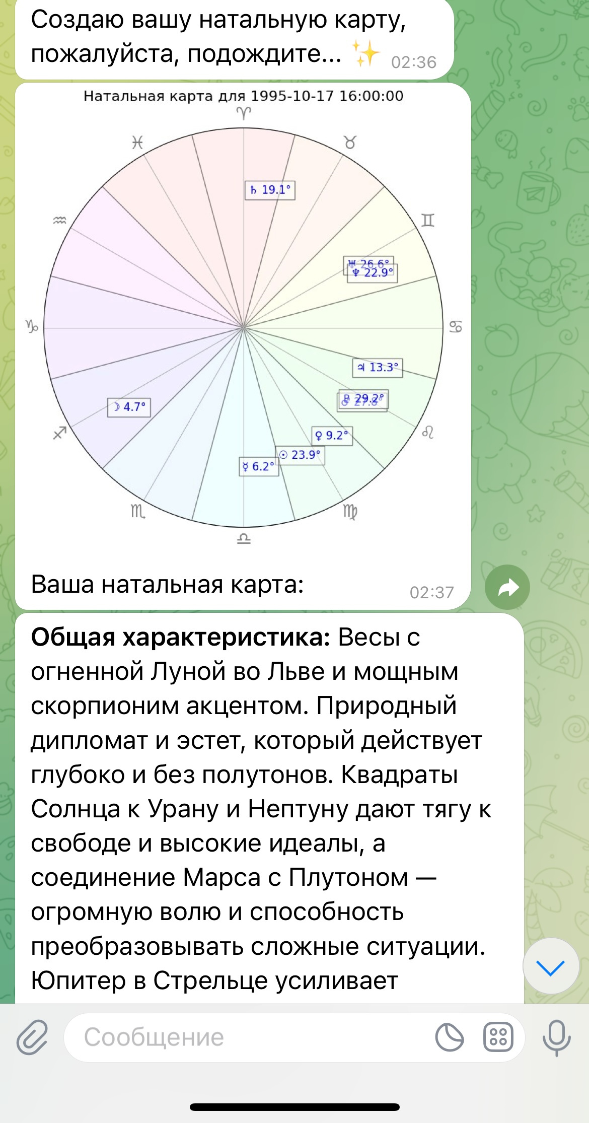 - Натальные карты: Дата, время, место рождения — бот рисует круговую карту зодиака с цветными секторами, символами планет и градусами (инфографика). Плюс AI-анализ характера, советов.