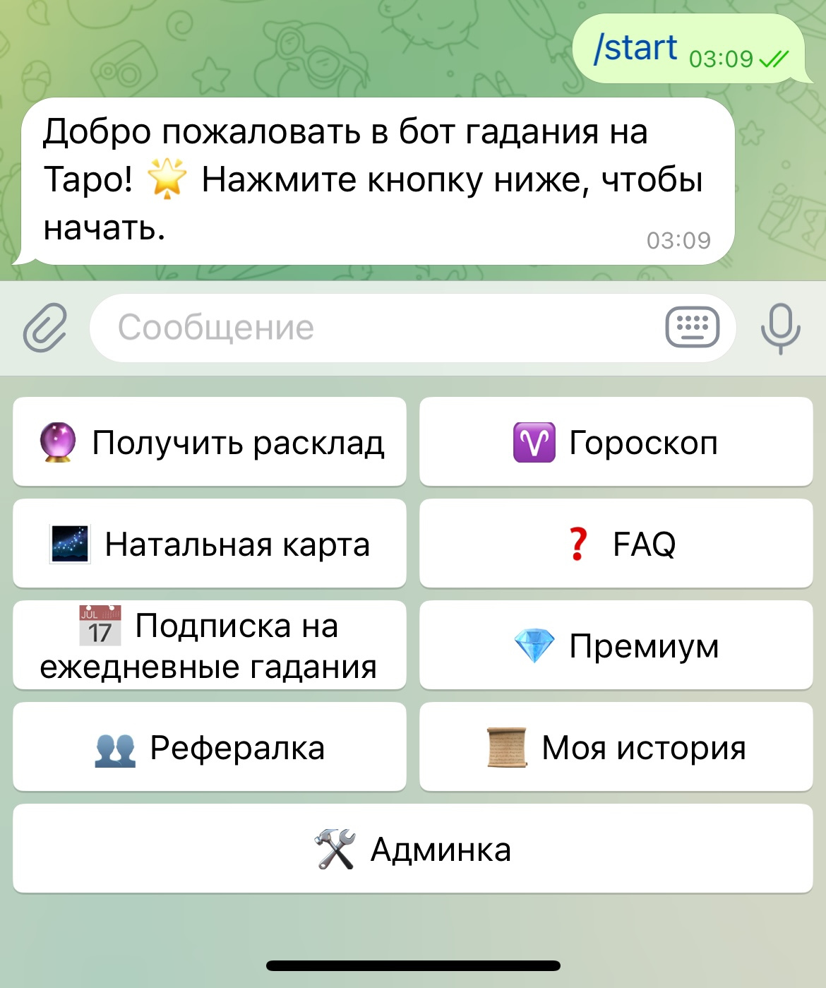 - Премиум и рефералка: 500р/мес за безлимит, +1 расклад за друга.