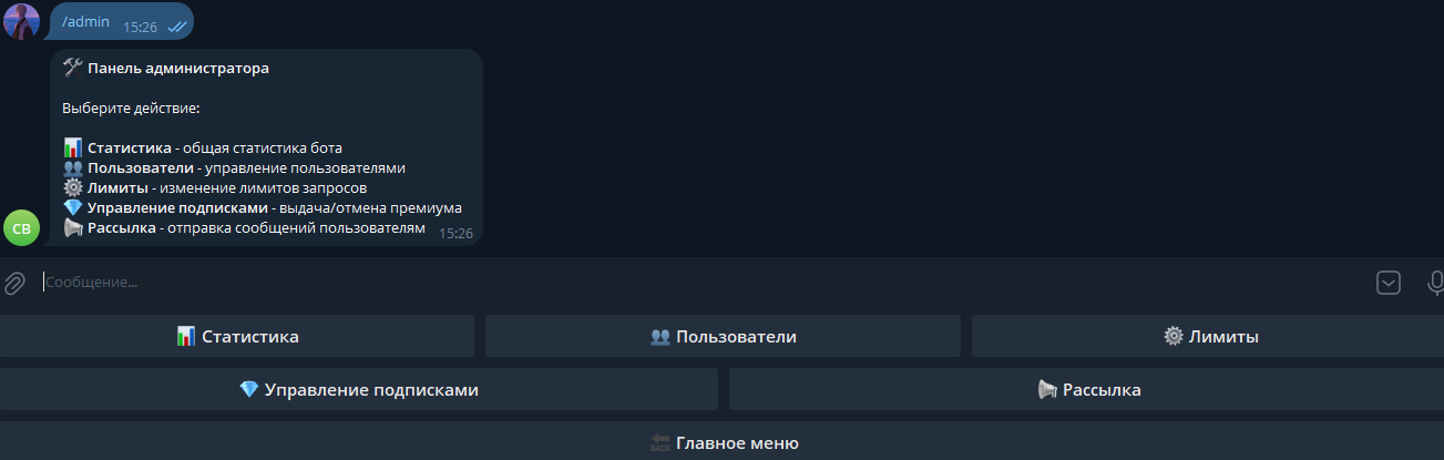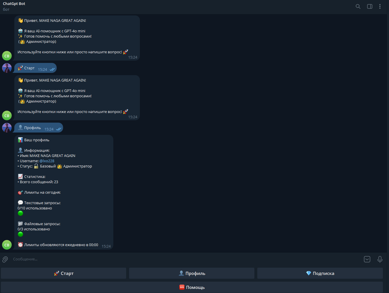 **Полностью функциональный AI-бот с системой монетизации через подписки и рекламу при помощи рассылок.**