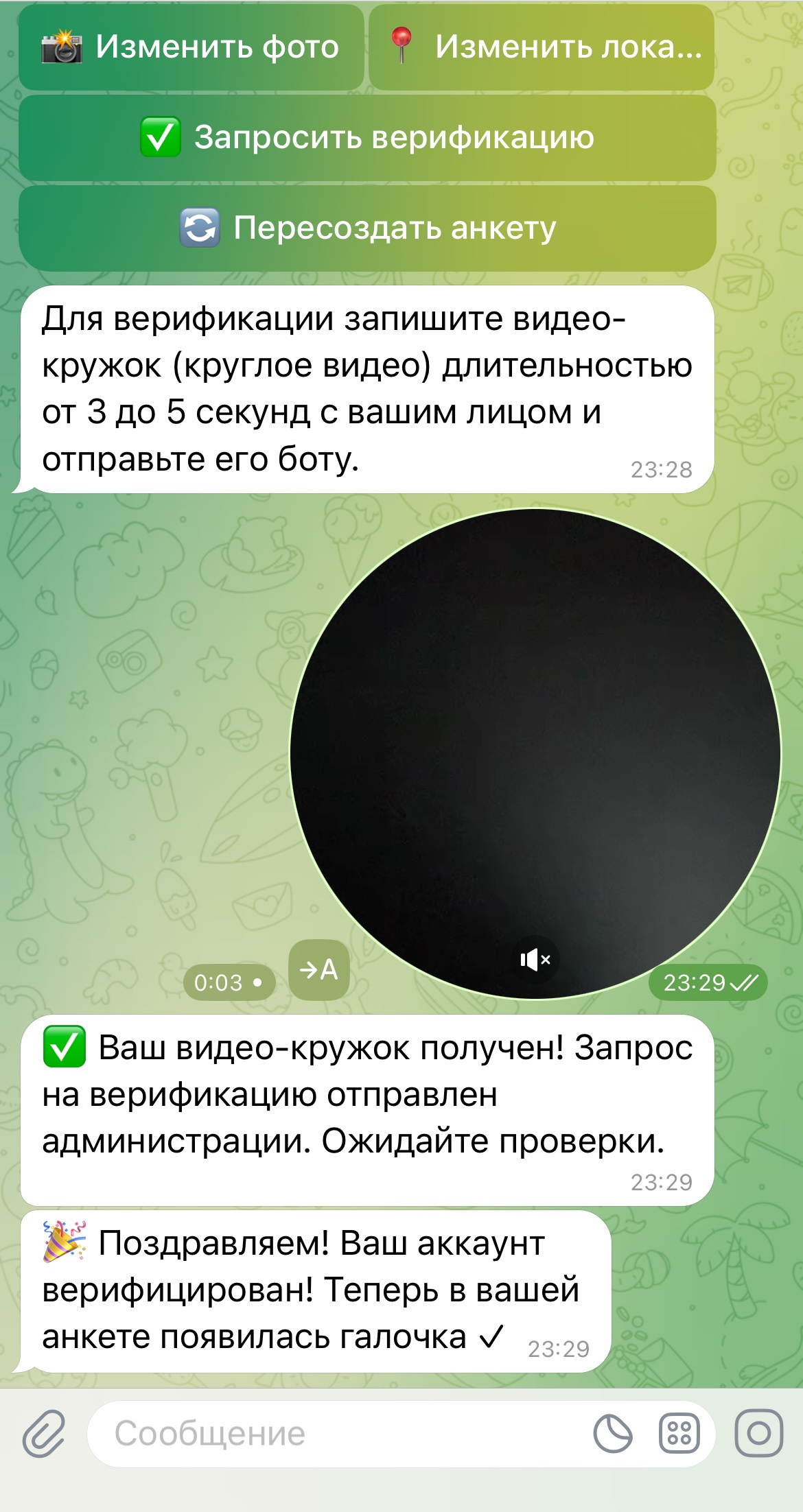 - Верификация: видео 3-5с, админ-проверка, +5 рейтинг, галочка .