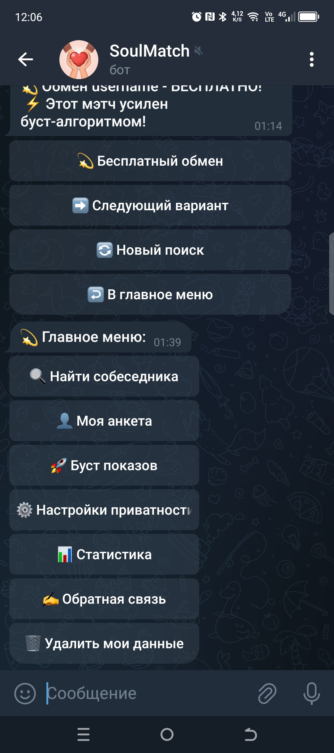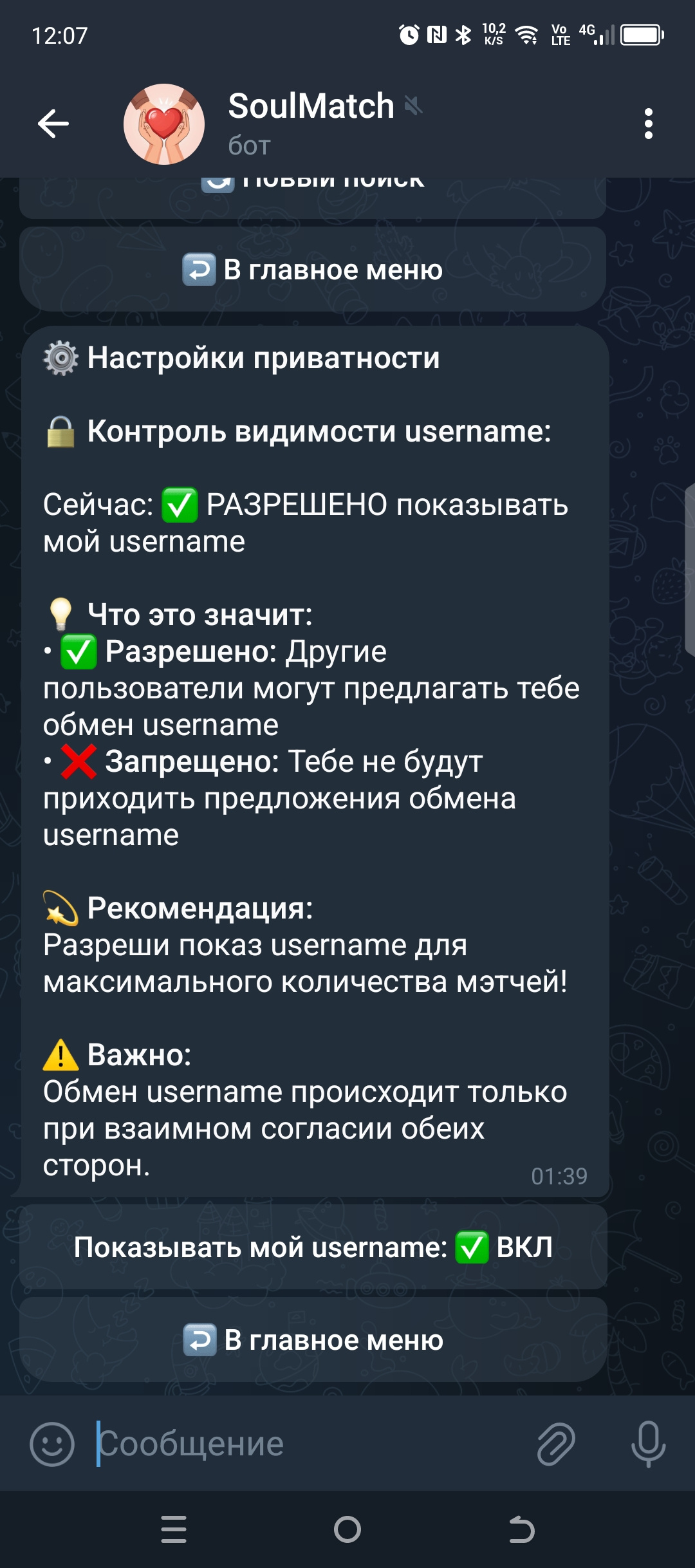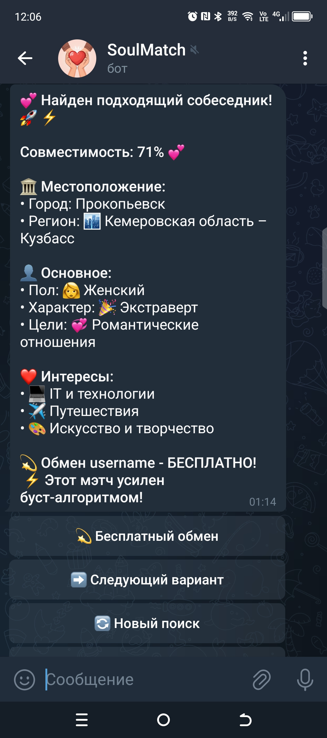 Добрый день! Продаю Telegram-бота для знакомств по интересам "SoulMatch", которого разработал в октябре 2025 года. К сожалению, не могу продолжать развитие проекта из-за семейных обстоятельств.
