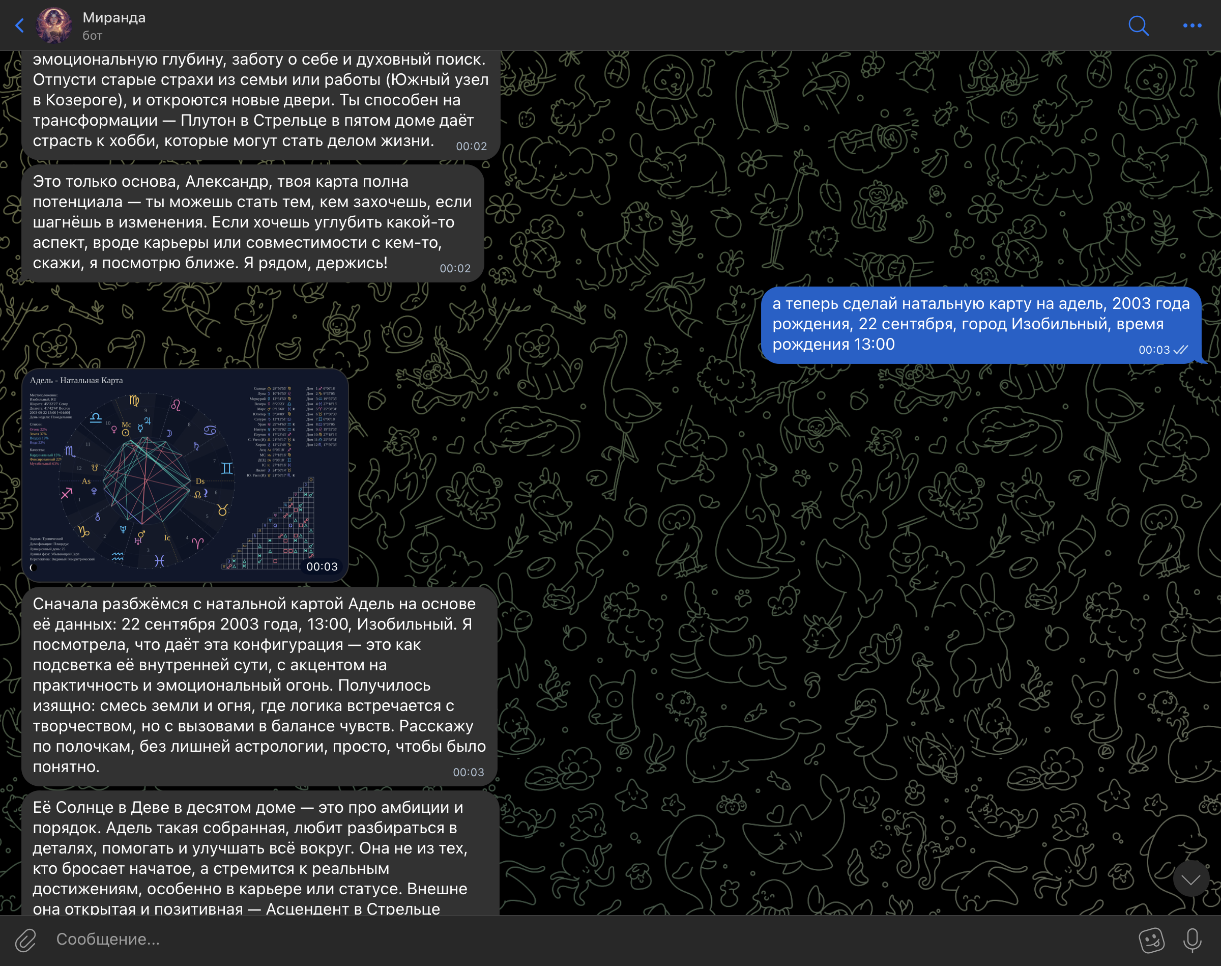 2. Бот-агент (Миранда) - ведет персональные диалоги с пользователями, создает натальные карты, анализирует расклады в контексте беседы