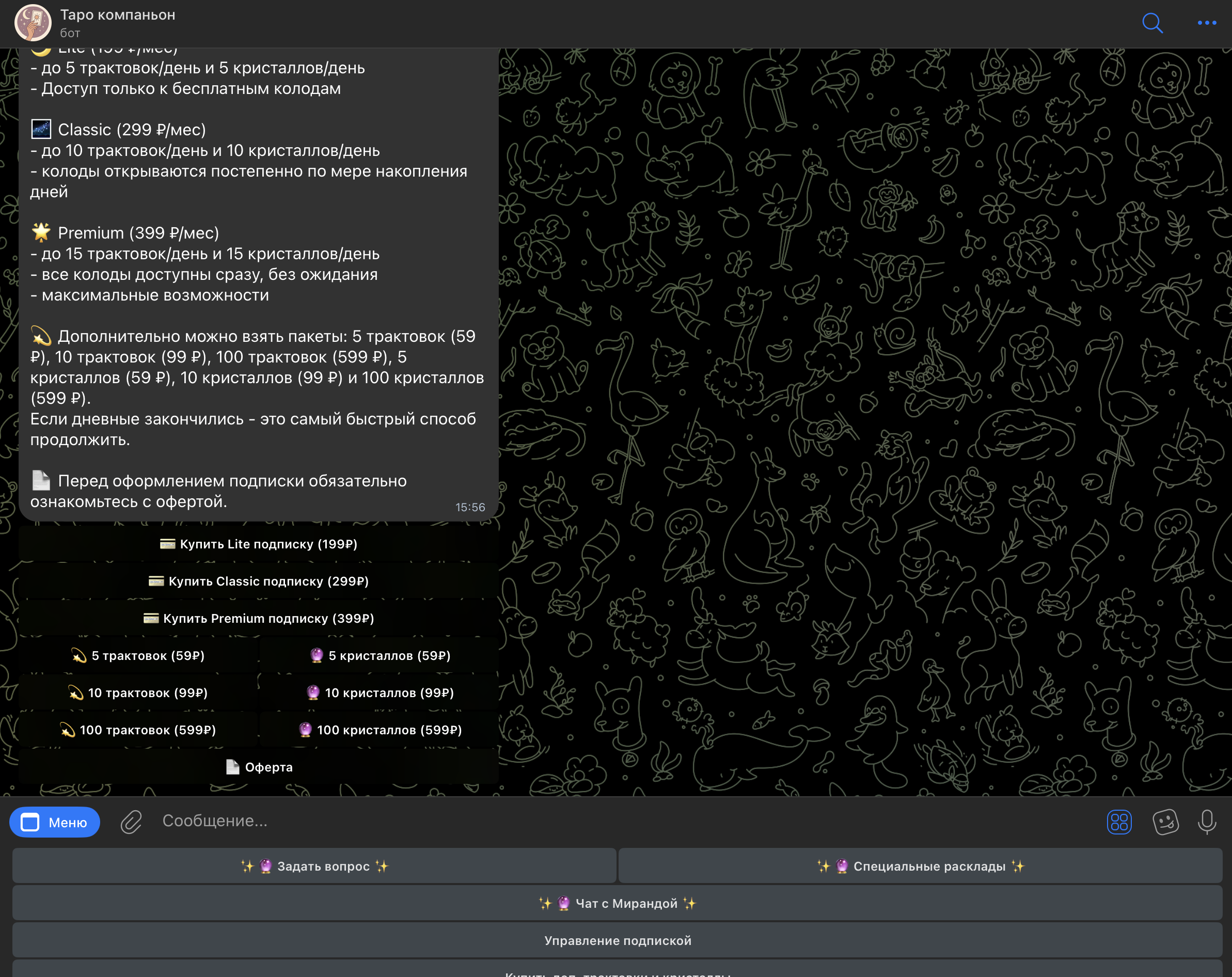 1. Основной бот (Tarot Companion) - предоставляет интерфейс для работы с приложением, управление подписками, выбор раскладов