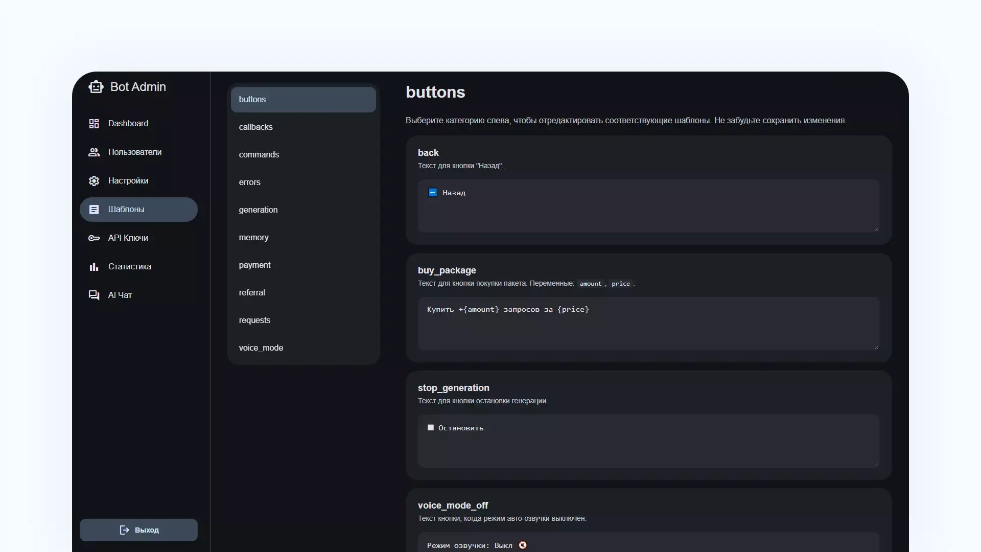 - Редактор шаблонов: Мощный инструмент, позволяющий менять любое сообщение бота (от приветствия до текста ошибки) без кода.